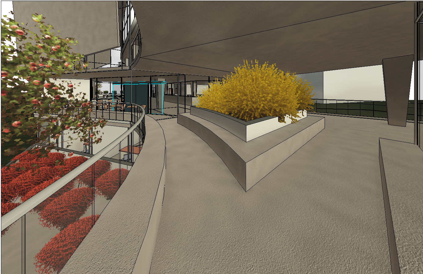a beautifully rendered architectural elevation of a contemporary building with moss covered concrete walls blending into its natural surroundings the fa ade is softened by lush greenery and climbing vegetation with large glazed openings that reflect the landscape the composition highlights the harmony between built form and nature with careful detailing balanced proportions and a natural color palette of greens greys and earthy tones atmospheric lighting enhances texture and depth