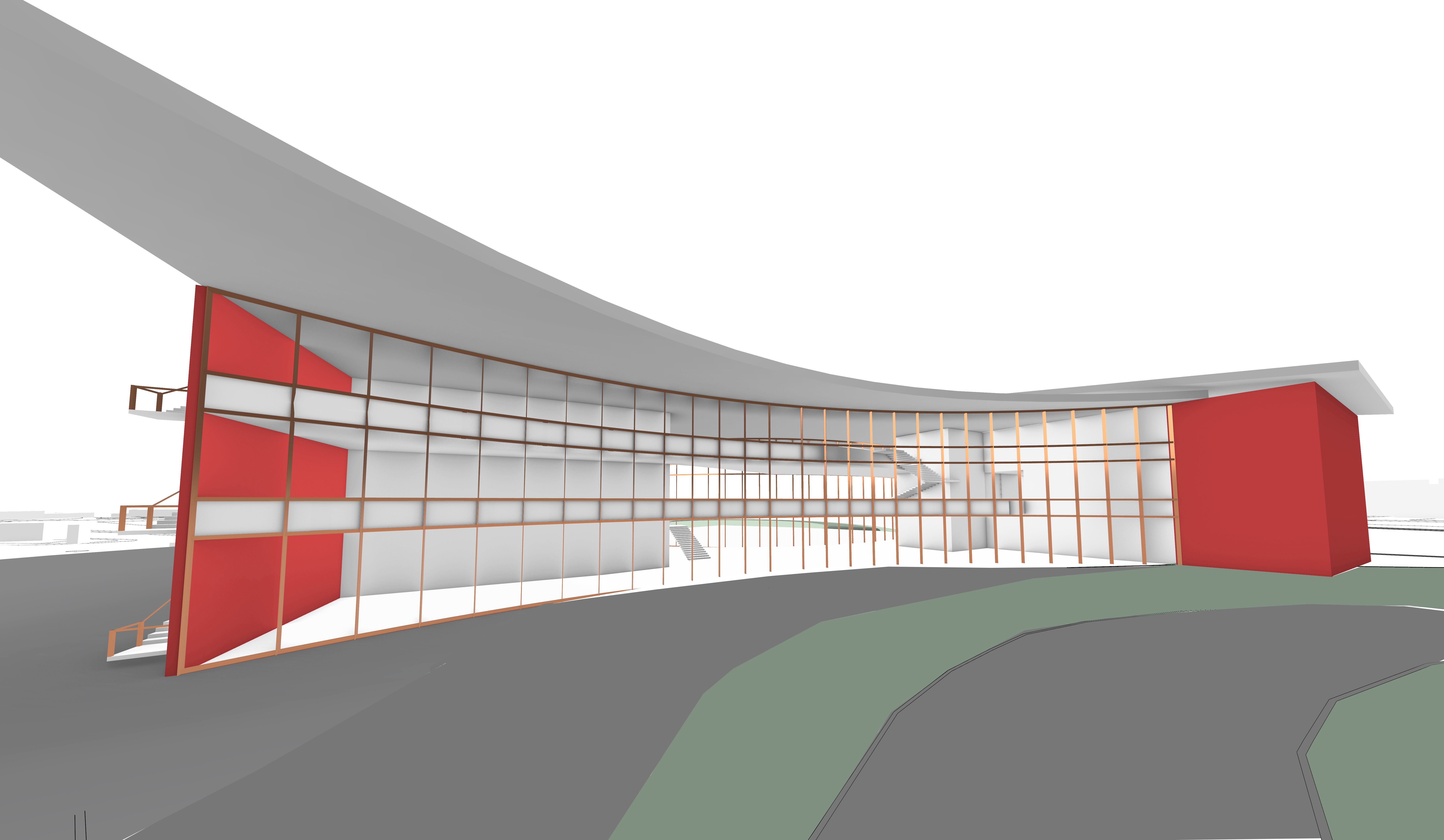 exterior shot render a modern architectural building with a sweeping curved design featuring a bold red brick exterior the building facade is dominated by large glass panels framed in light brown allowing natural light to pour through incorporate soft grey tones for the roof and add subtle shadows for depth the building stands on a smooth charcoal colored ground surrounded by a public park with fields and trees capture a serene atmosphere with bright daylight and a clear sky emphasizing the building s elegant architectural lines and vibrant contrast of colors