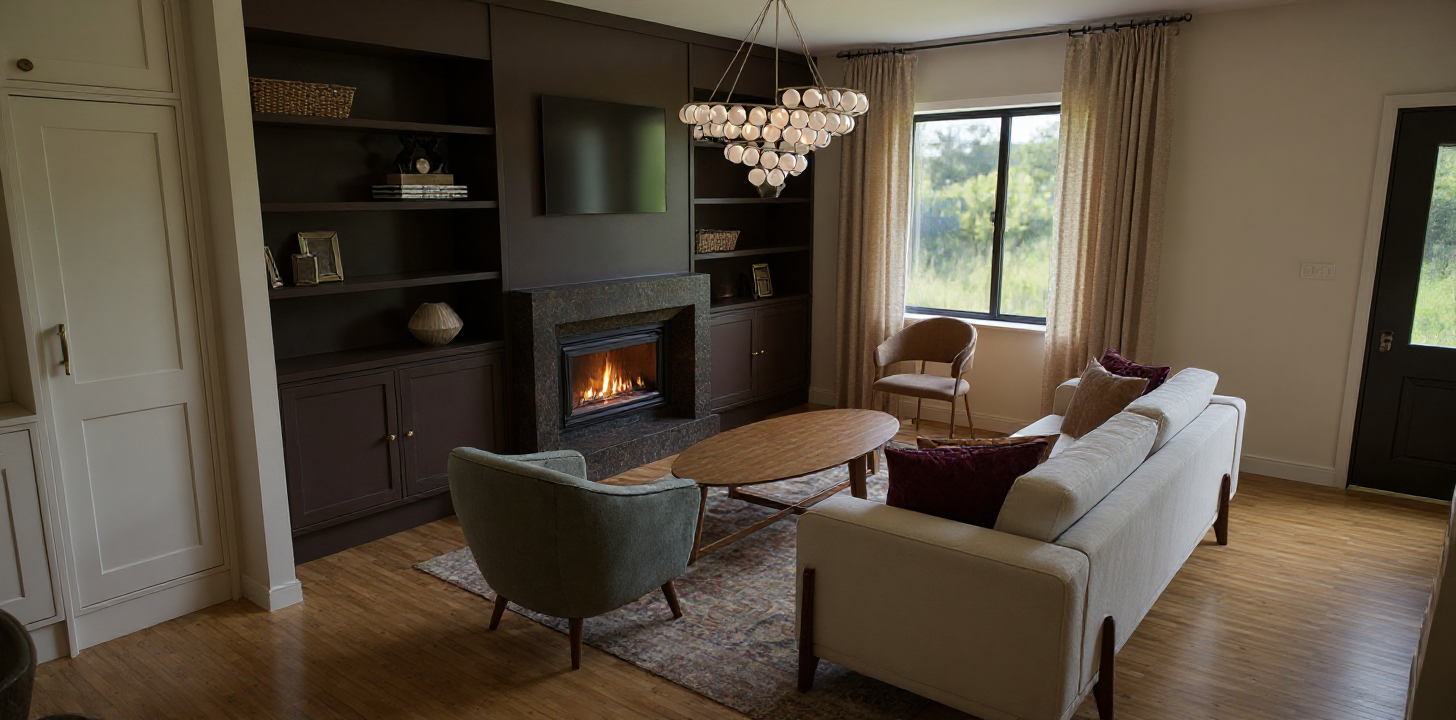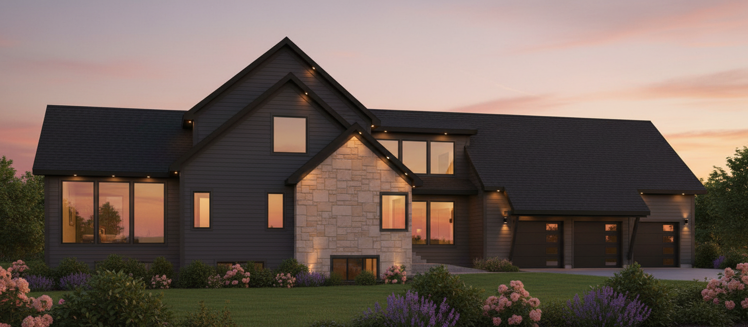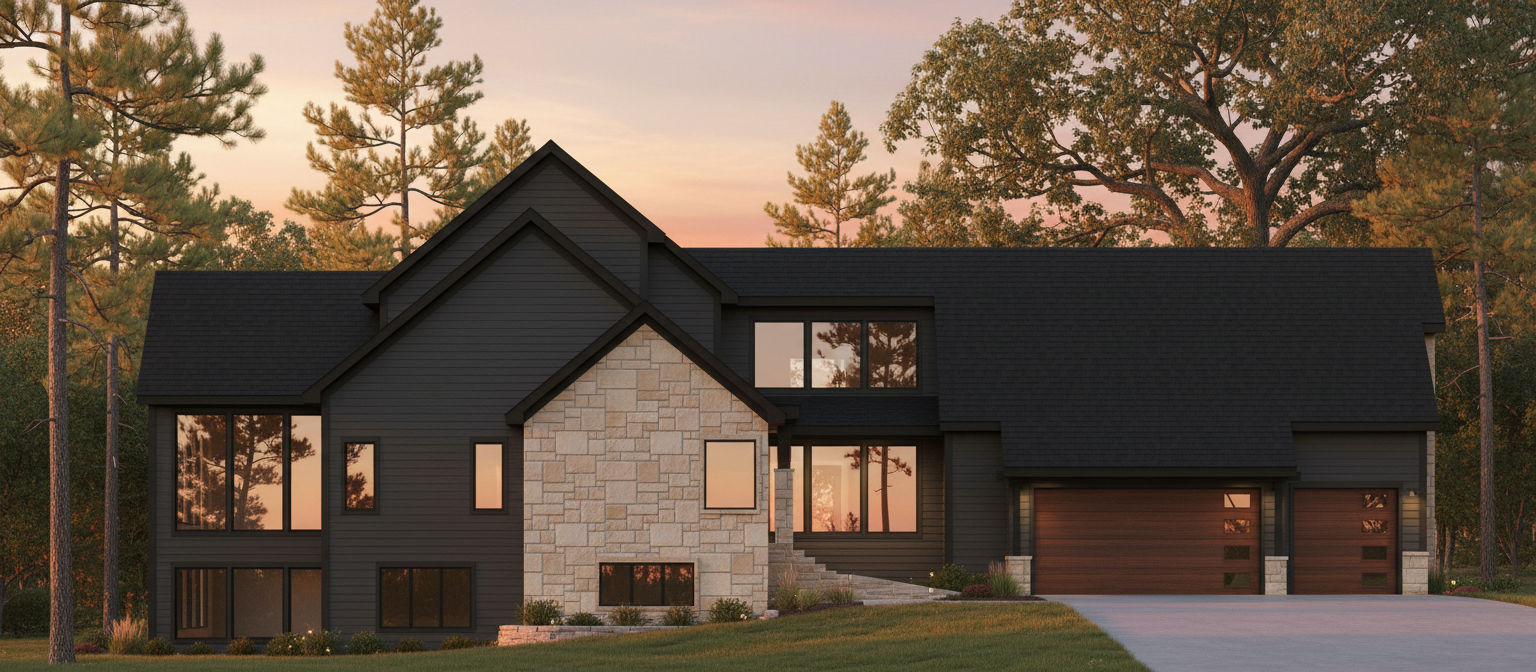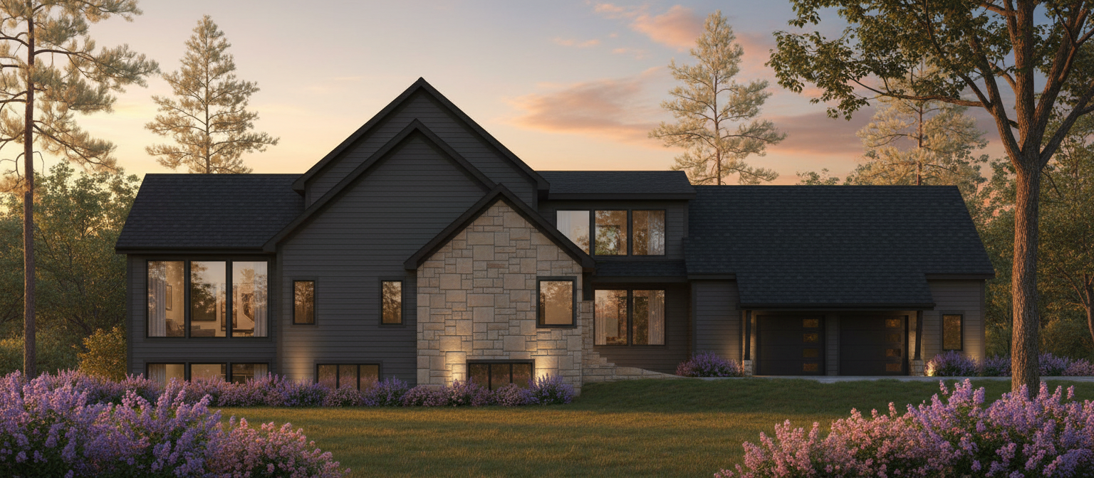 render a modern house with a sleek contemporary design the exterior features a mix of lp smartside and stone textures the lp smartside is a dark gray while the stone accents are a warm beige the windows are large and reflective the roof is black surround the house with towering white pines and oaks it is golden hour suggesting a serene sunset the overall atmosphere is peaceful and inviting enhanced by soft warm up lighting illuminating the exterior