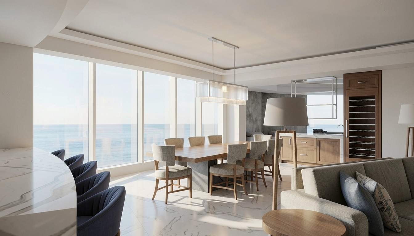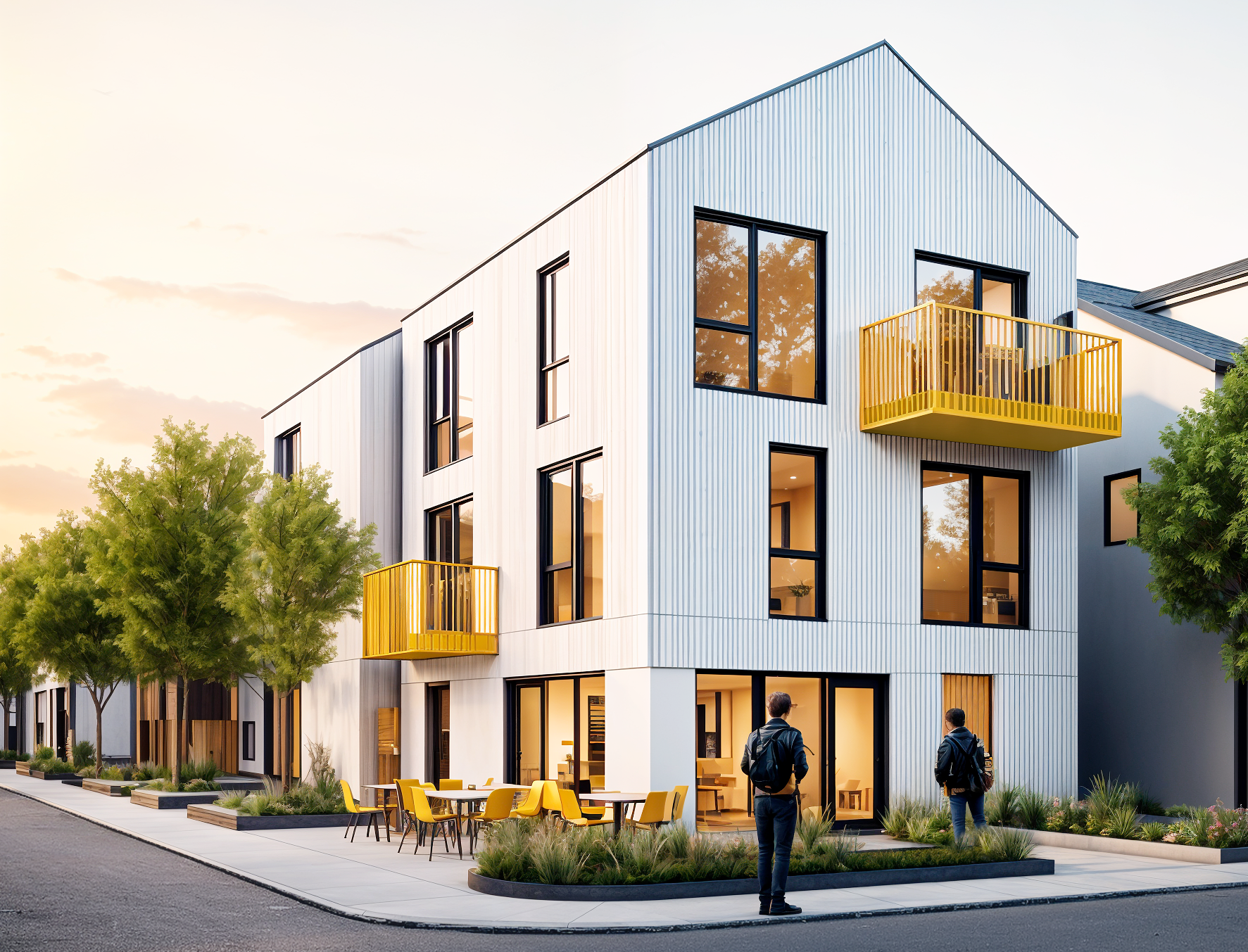 transform the modern structure into a traditional arts and crafts style residence replace flat surfaces with traditional color sage green vertical board and batten siding white trim and fascia with red tumbled brick near the base of the structure features low pitched gable roofs with wide overhanging eaves exposed decorative rafter tails and tapered square columns with brick base supporting a deep front porch bottom level is commercial cafe with outdoor seating with a sidewalk in the front and grass park on all sides balconies are required for the upper third floor windows should be vertically oriented multi pane true vertical oriented divided lite with thick wood trim incorporate earthy textures hammered copper hardware metal roofing and tumbled brick accents lighting should be warm featuring mission style amber glass lanterns high detail organic textures cozy and artisanal atmosphere