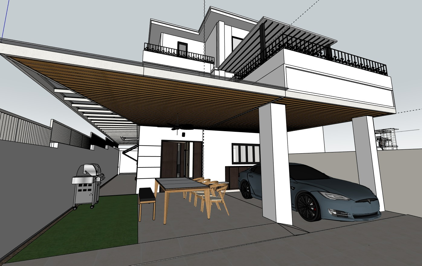 modern house with a contemporary design featuring a sleek two story architecture the walls of the building are in a pristine white accentuated by black railings and window frames the car parked is a deep metallic grey contrasting with the soft earthy tones of the driveway tiles the outdoor table is set under a wooden pergola which has rich walnut brown slats the barbecue grill is stainless steel adding a touch of polished metal the outdoor seating area includes chairs with natural wood textures for the lawn area use a refreshing green enhancing the serene and welcoming atmosphere the overall ambiance is relaxed and elegant with a clear blue sky suggesting a sunny day