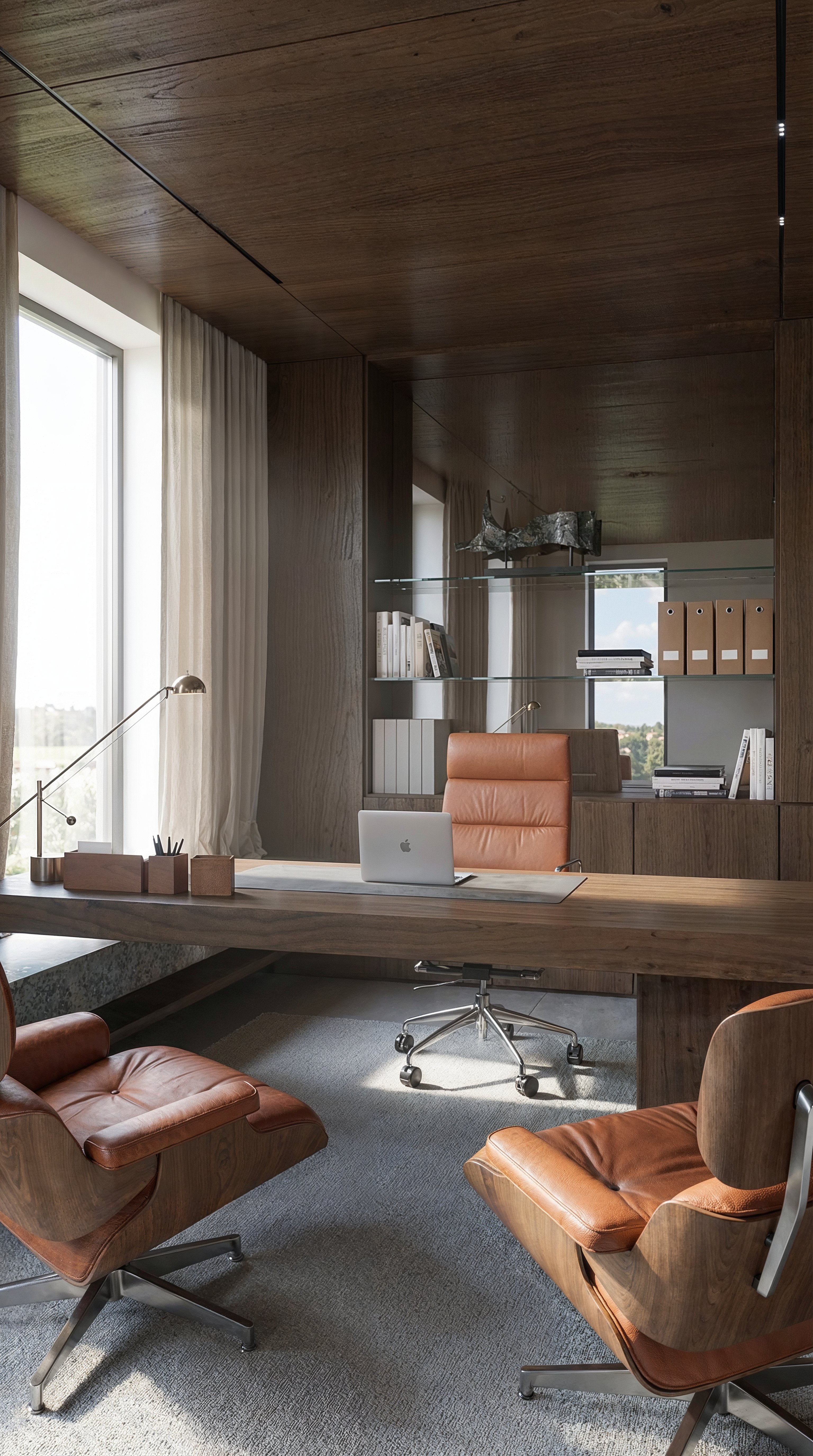transform this architectural visualization of a modern office into a hyperrealistic photo taken with a professional arri alexa lf camera at 8k resolution 7680x4320 16 9 landscape image format shallow depth of field f 2 8 focused on the desk and chairs creating beautiful creamy bokeh in the background behind the windows foreground razor sharp with subsurface scattering on the armchair leather emphasizing natural pores and material wrinkles background with subtle natural camera blur walls covered in dark walnut wood paneling matte finish with visible grain natural imperfections and subtle joints ceiling in matching wood floor polished concrete with faint stains and texture large right side windows with sheer white curtains diffusing natural daylight soft shadows on floor and walls from side sunlight blurred green foliage outside in bokeh central massive desk with thick oak wood tabletop matte finish natural grain light scratches and edge folds on surface open macbook pro laptop displaying a spreadsheet subtle screen glow glass of water with condensation spiral notebook with pen lying iphone left side low wooden side table with potted monstera plant realistic leaf veins and dew drops right side ergonomic office chair with black mesh fabric matte with natural folds and chrome armrests on wheels armchairs left club armchair in brown aniline leather visible pores wrinkles creases subtle sheen from use subsurface scattering for skin realism right similar armchair with footrest leather with natural folds and light dust lighting warm diffused key light from above and front simulating stadium lighting mixed with natural daylight fill light from left reducing shadows wing shaped floor lamp matte metal with warm glow and catchlights in reflections architect desk lamp with green glass shade aimed at desk catchlights in pupils reflected on chrome and leather black 65 flat tv on left wall with matte frame powered off color grading desaturated natural palette with earthy browns beiges and greens professional film color grading like architectural digest subtle 35mm film grain no digital artifacts no oversaturated colors eye level shot from low angle 1 2m like professional interior photography with soft rim light highlighting furniture edges