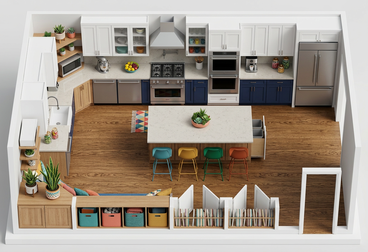 show me a breakroom with this floor plan and slim profile black shaker cabinets with white quartz countertops
