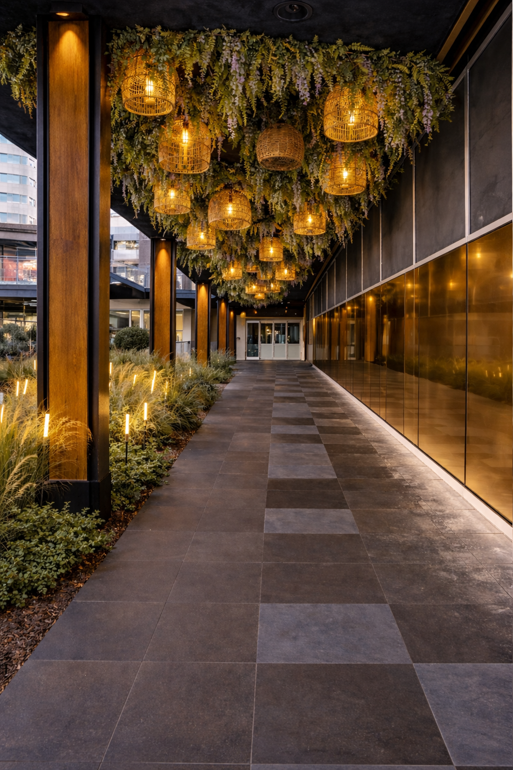 la cenefa de la derecha es espejo bronce no modifiques nada mas las colunnas deben tener una wood plank in between the steel bems