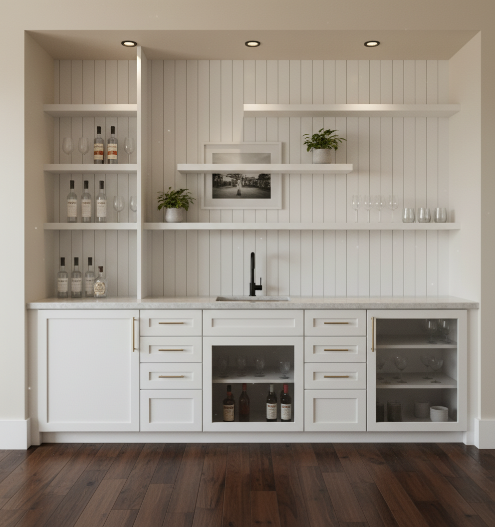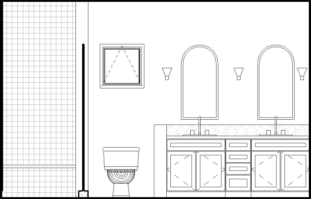 a photorealistic high resolution interior rendering of a modern farmhouse bathroom designed for architectural showcase retain all existing details white shaker cabinetry white window panes light gray quartz countertops light gray ceramic tile flooring emphasize realistic material textures subtle reflections on the countertops soft matte paint finishes on cabinetry natural daylight streams through the windows creating balanced illumination with gentle highlights and shadows maintaining focus on the bathrooms clean timeless design and craftsmanship