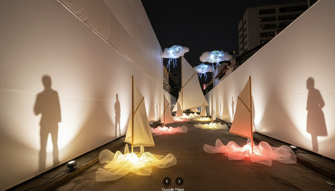 a singapore alleyway with a light and shadow art installation a white fabric scaffolding covers the left wall of the alley while the right wall is a mural phinisi sail masts of different heights are scattered along the alley way made of white fabrics with upwash lighting each masts base is made up of mesh fabric to look like waves which glow in warm colours at the end of the lane is a giant sail with fabric clouds overhanging and subtle lightning effects spotlights cast numerous shadows of people against the left walls people fill the lane warm light spotlights cast a warm glow over the entire space