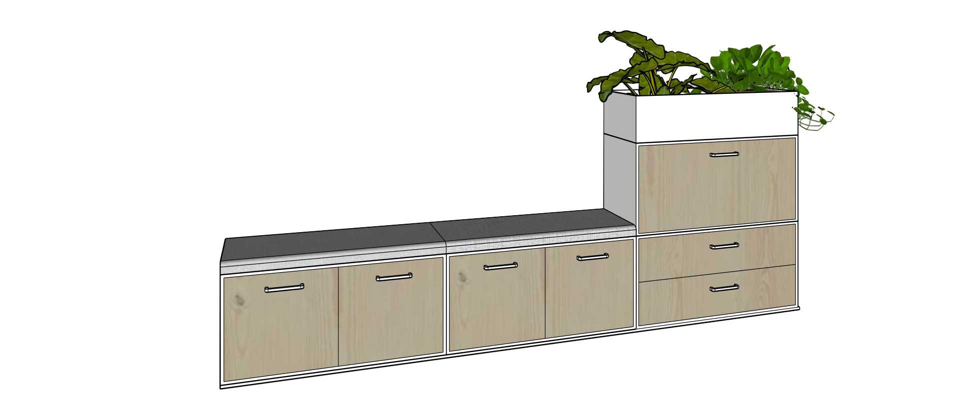 le meuble est dans une pi ce blanche vide les coussins sont en tissu gris le meuble n a pas de pied les caissons sont blanc et les portes et tiroirs sont en ch ne naturel