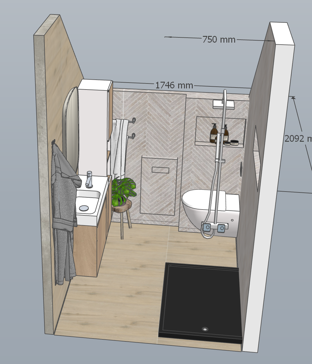 place a glass shower screen between the shower and toilet
