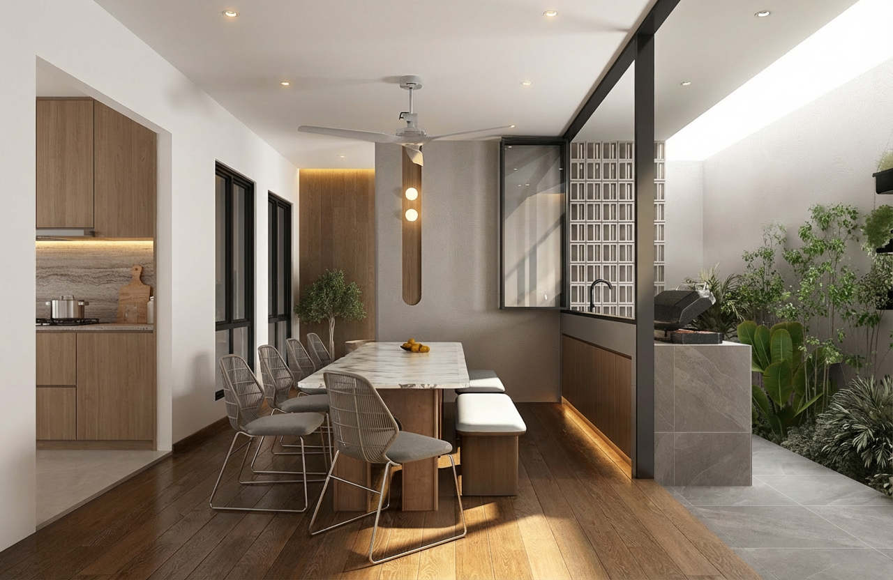 create a hyper realistic rendering interior shot of modern flat kitchen natural oak wood cabinets comfy sofa with throw artwork above sofa tone should be relaxing and inviting
