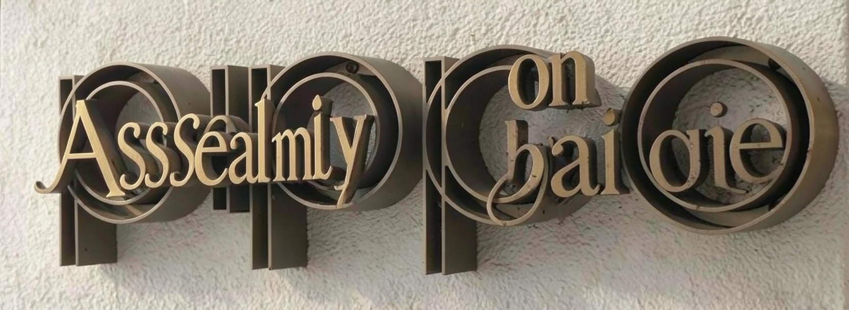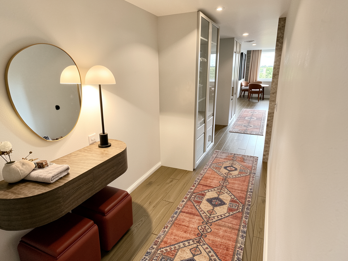 brown drystack stone walls flagstone patio cushions of curved bench dark water in spa with people in it dusk