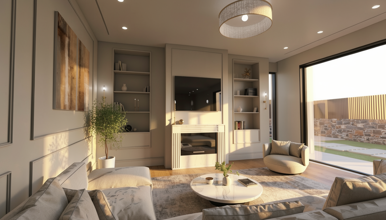 realistic appartment terrace with warmer natural daylight realistic background clear water bottle and glasses pouf and one pillow in brown velvet flower pot in dark anthracite with texture keep colors textures and proportions