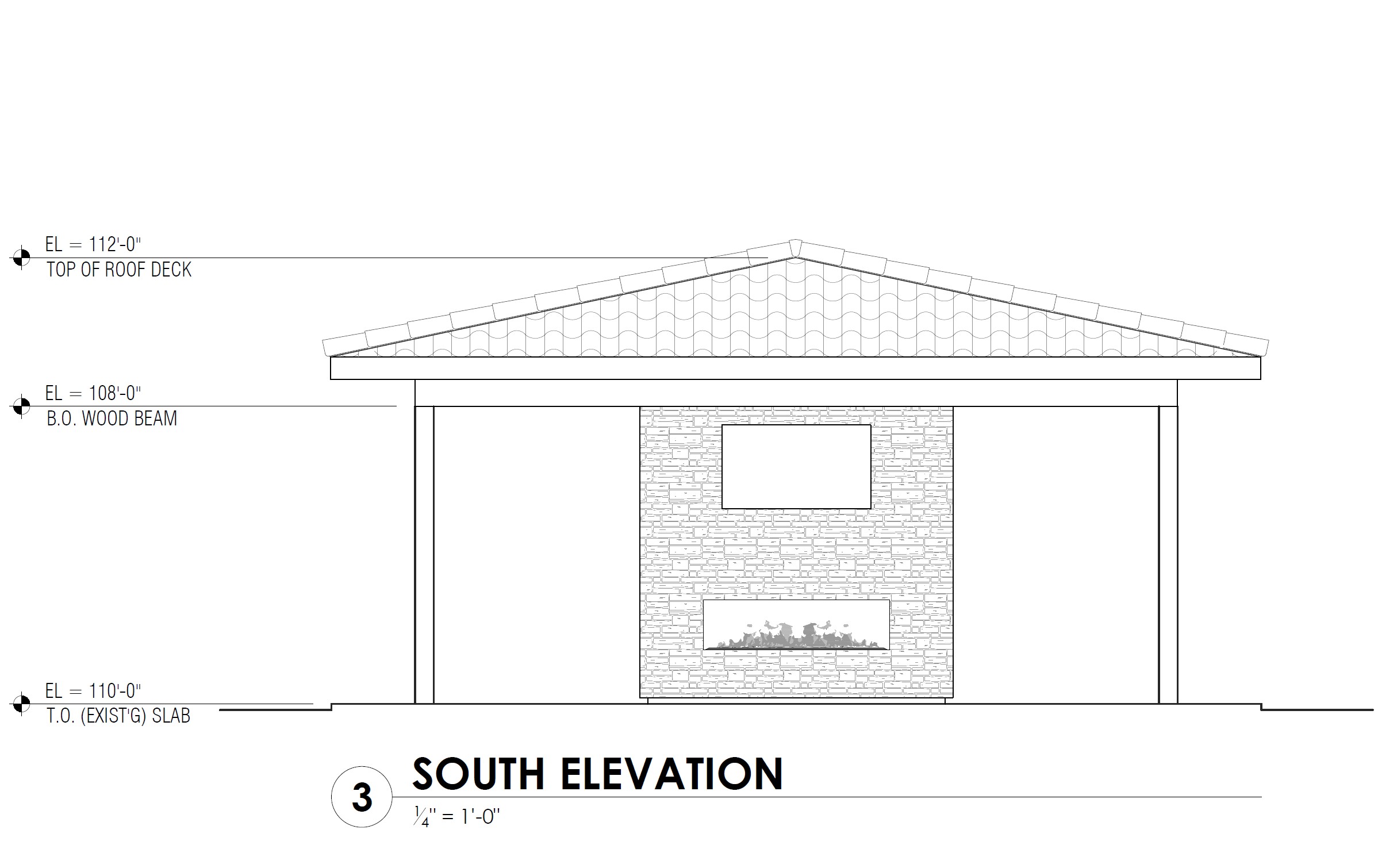 im looking north at the new backyard ramada stay with this view construct a new free standing ramada with 4 wood post and a wood beam painted dec750 bison beige rl 649 wood fascia painted det695 grange hall rl 992 the roof will be concrete barrel shaped roof tiles desert tan the framed wall in the backdrop has adhered cultured stone veneer and 72 long low profile fireplace and a 54 flatscreen tv monitor above to watch american football sports the existing 25 x25 concrete slab is in the rear yard toward the north end to the south there is a walkway landscape rock and second walk adjacent to an existing 6 x6 square spa centered on the ramada and a long rectangular pool centered on the ramada extends south end of the yard and out of the picture there is approximately 12 of pool deck between the pool and spa with the pool and spa height at the top of walk level there is a 6 high cmu wall approximately 20 north of the new ramada the cmu wall is painted de6214 pigeon gray rl 570 there is very short green grass between the ramada slab and wall with a 4 wide landscape rock path along the base of the cmu wall