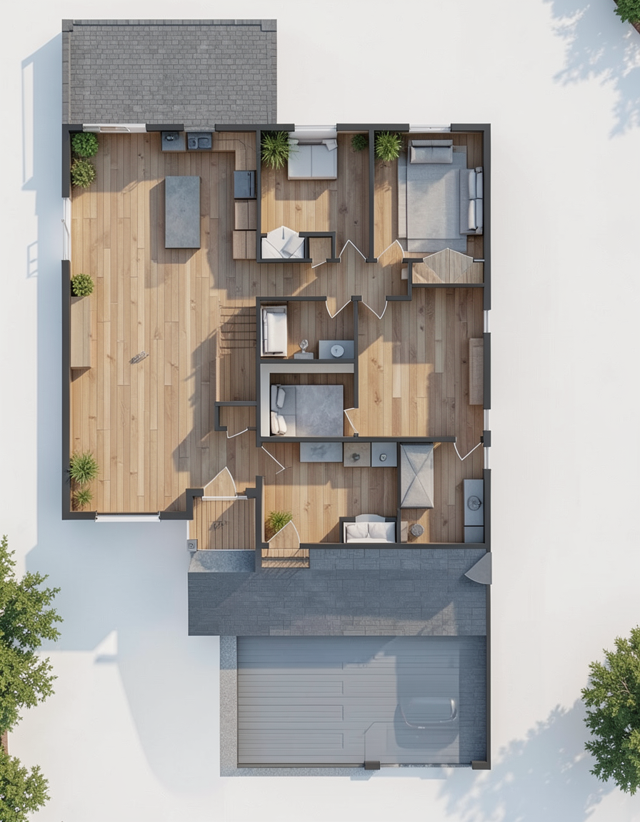 make the image look photorealistic do not alter the design or materials adjust the ambiance lighting slightly do not make it too sunny and do not add unnecessary lighting remove the sunlight