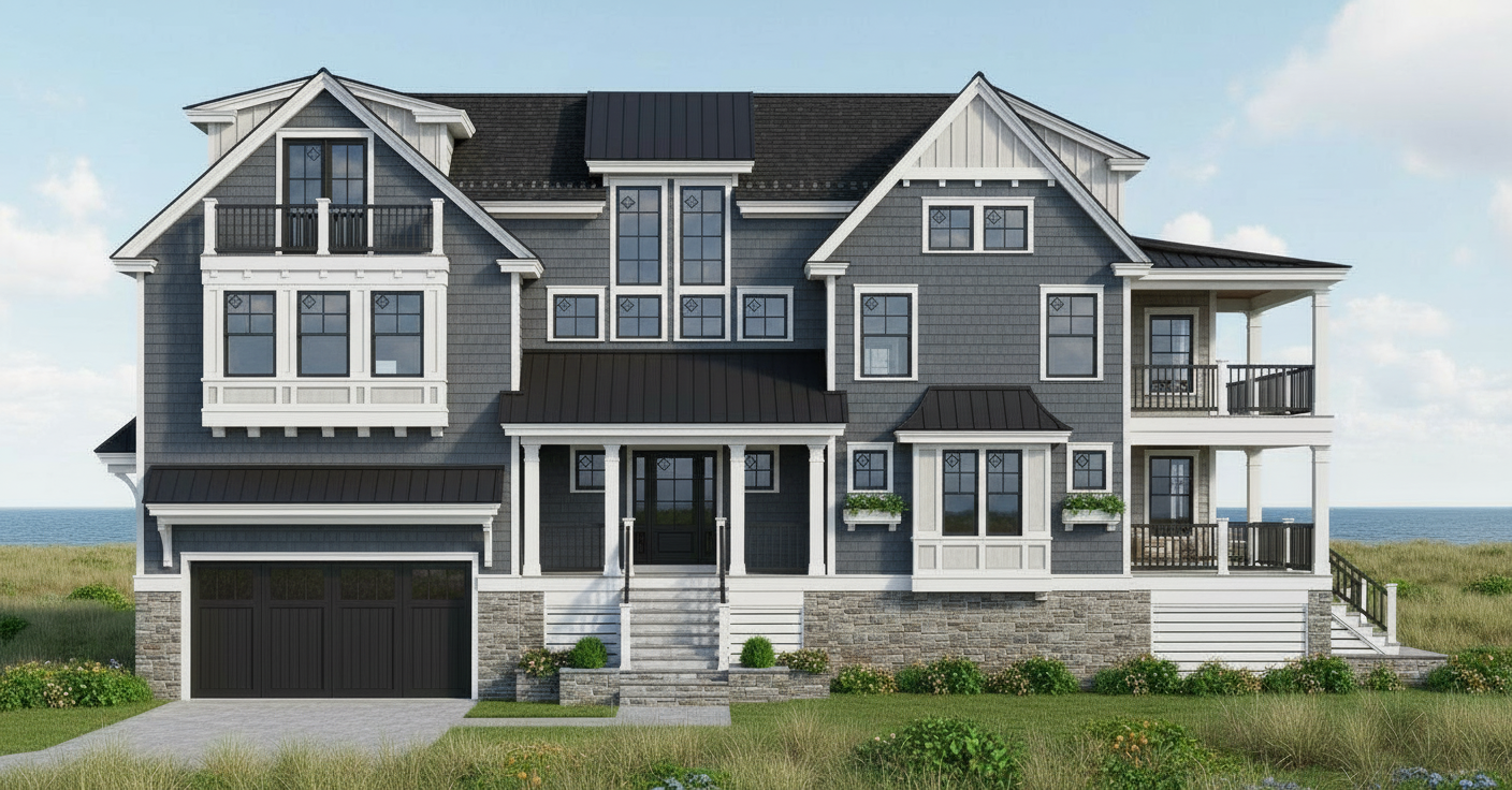 partly cloudy sky add gutters and downspouts some deciduous trees in background cliff with lake in foreground