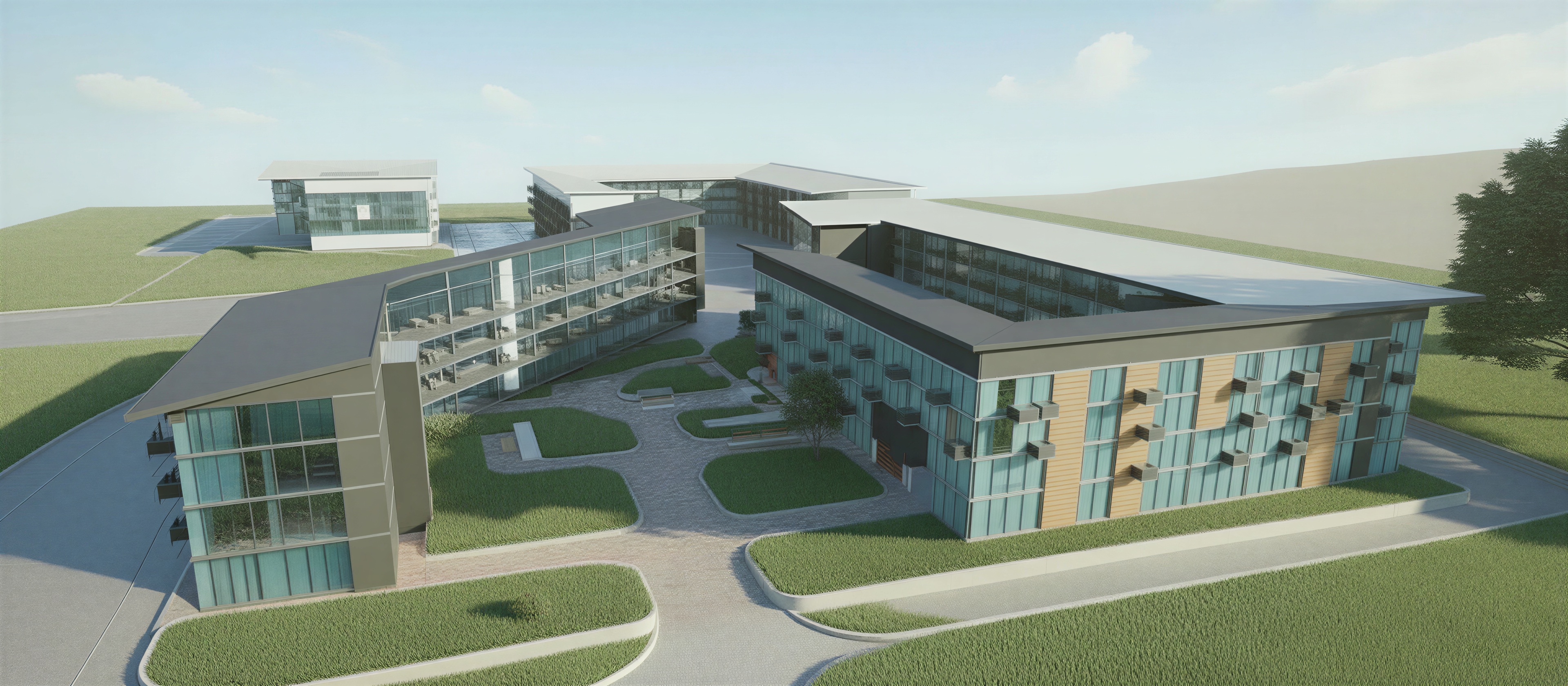 render a modern architectural complex with sleek contemporary design the buildings feature large glass panels that reflect the clear blue sky with walls in soft neutral tones of light grey and beige the roof is a darker shade of grey adding contrast surround the buildings with lush well manicured green grass and subtle elegant pathway patterns in a muted grey the atmosphere is serene and sunlit with a crisp clear sky and a few fluffy white clouds creating a peaceful inviting environment incorporate comfortable seating areas along the pathways blending seamlessly into the modern landscape design