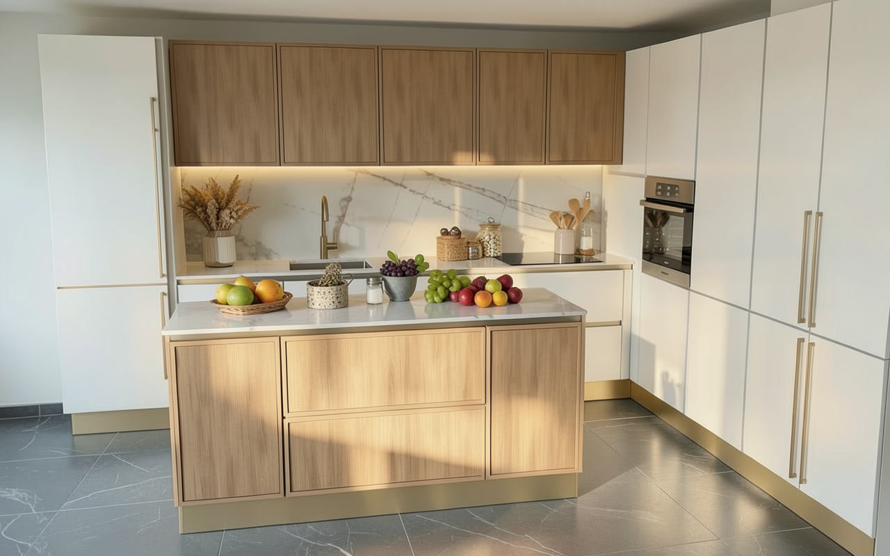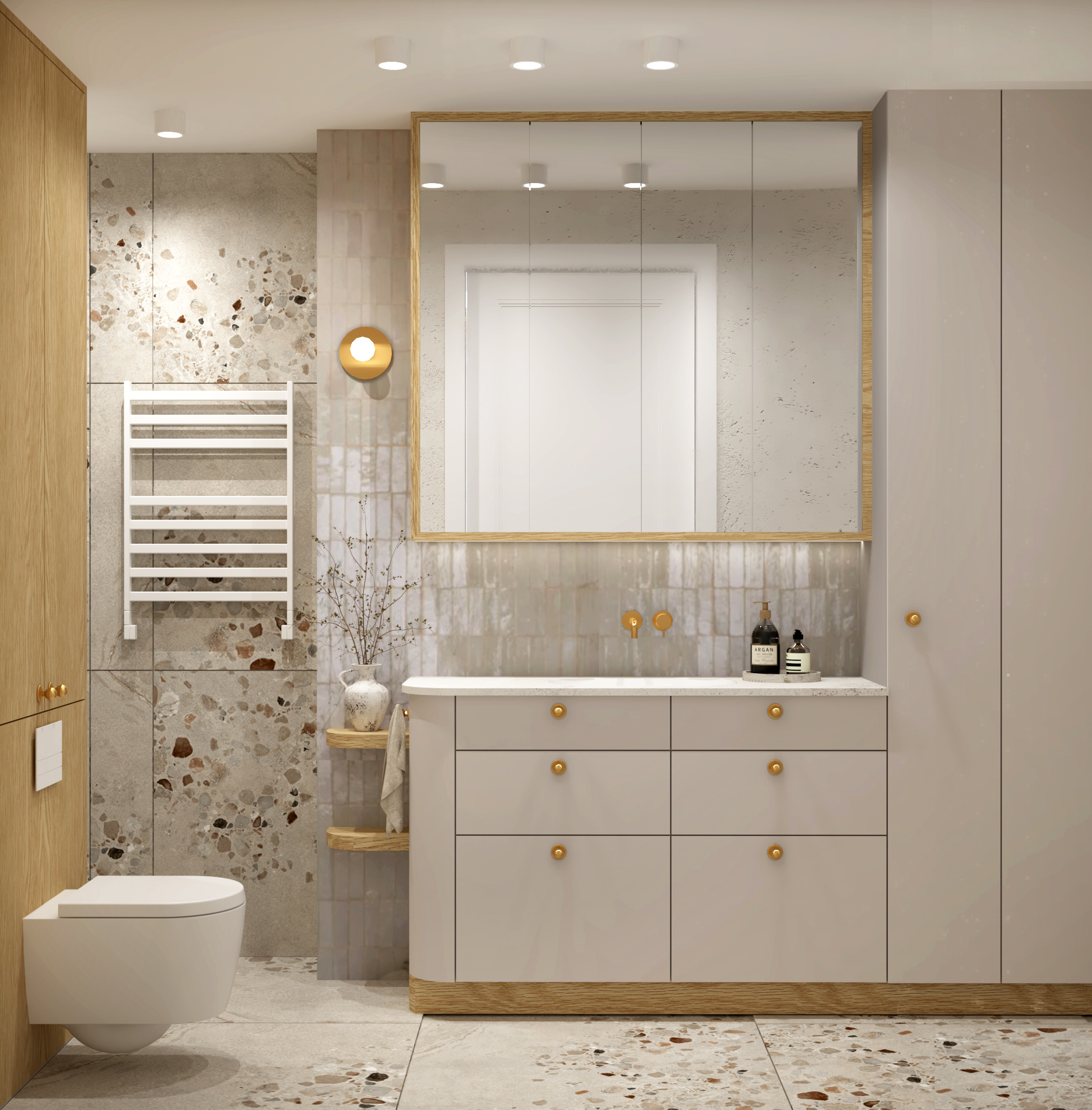 oak wood in a natural tone light and matte no daylight artificial lighting in a warm color under the cabinet above the sink and ceiling mounted a cozy bathroom in a japandi wabi sabi style