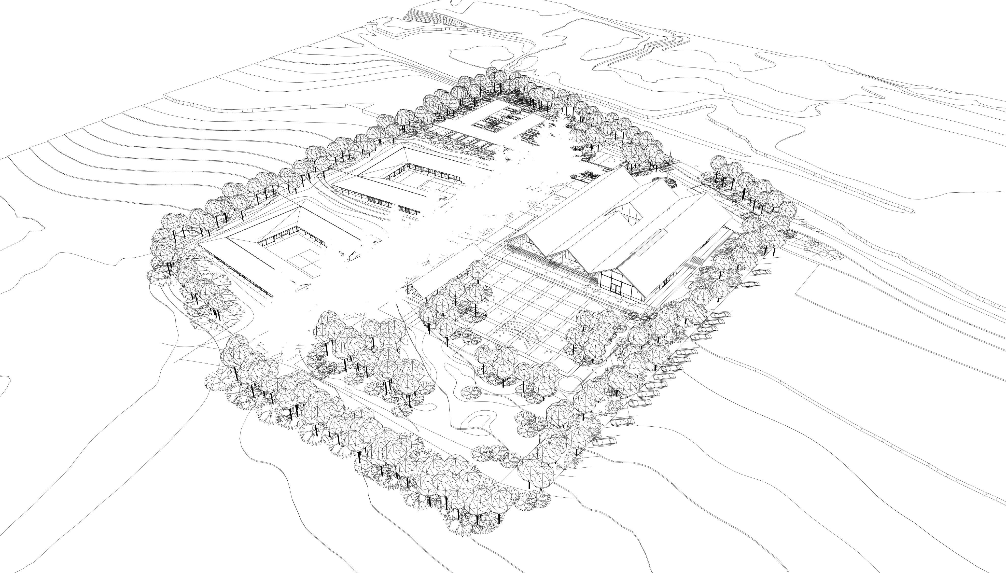 photorealistic aerial perspective of the architectural site sketch showing multiple buildings with pitched roofs surrounded by trees detailed landscaping with pathways and a courtyard realistic textures of grass trees building materials like metal wood for roofs natural daylight lighting crisp shadows and high detail suitable for architectural visualization and client presentation