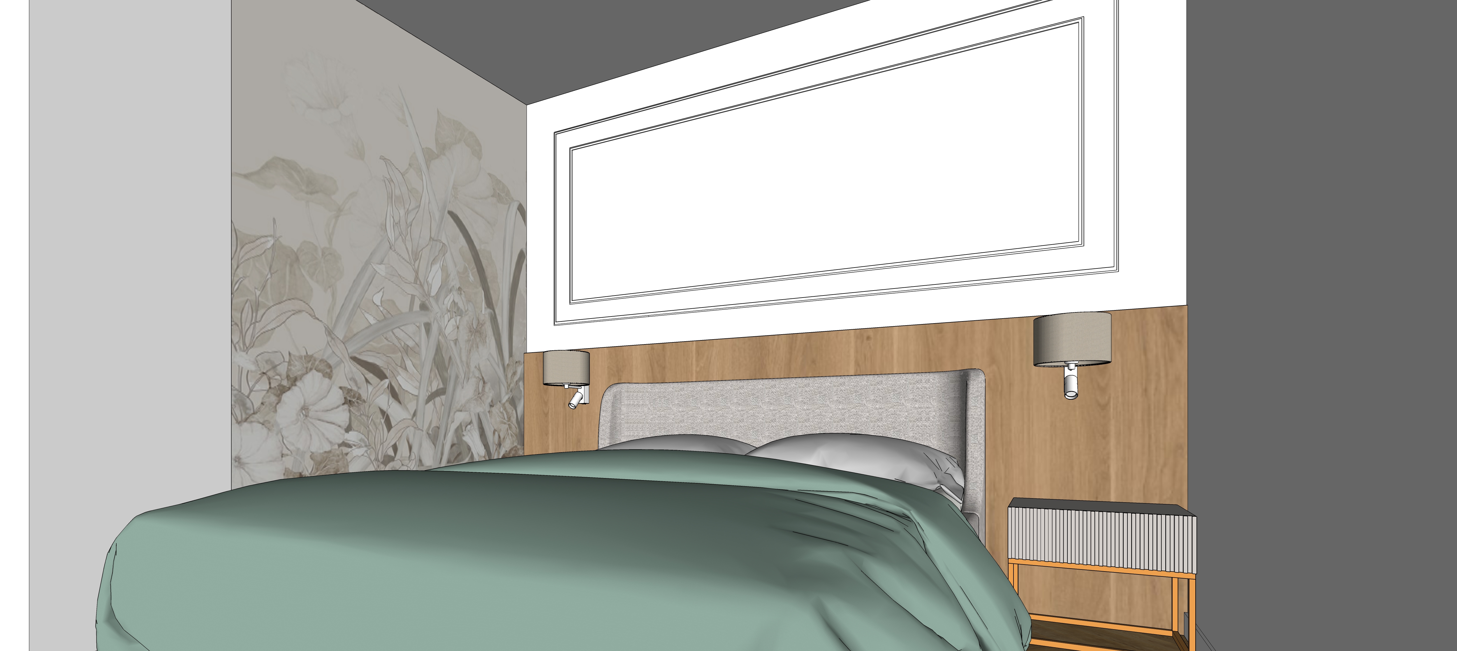 create a photorealistic visualization white walls and ceilings leave the decorative wall moldings on the wall above the bed as they appear in the original photo don t change the color of the bedside tables the bedside tables are beige replace only the yellow elements with brushed gold the wallpaper should be matte leave the pattern and color of the wallpaper as they appear in the original photo add a soft texture to the mint colored bedspread