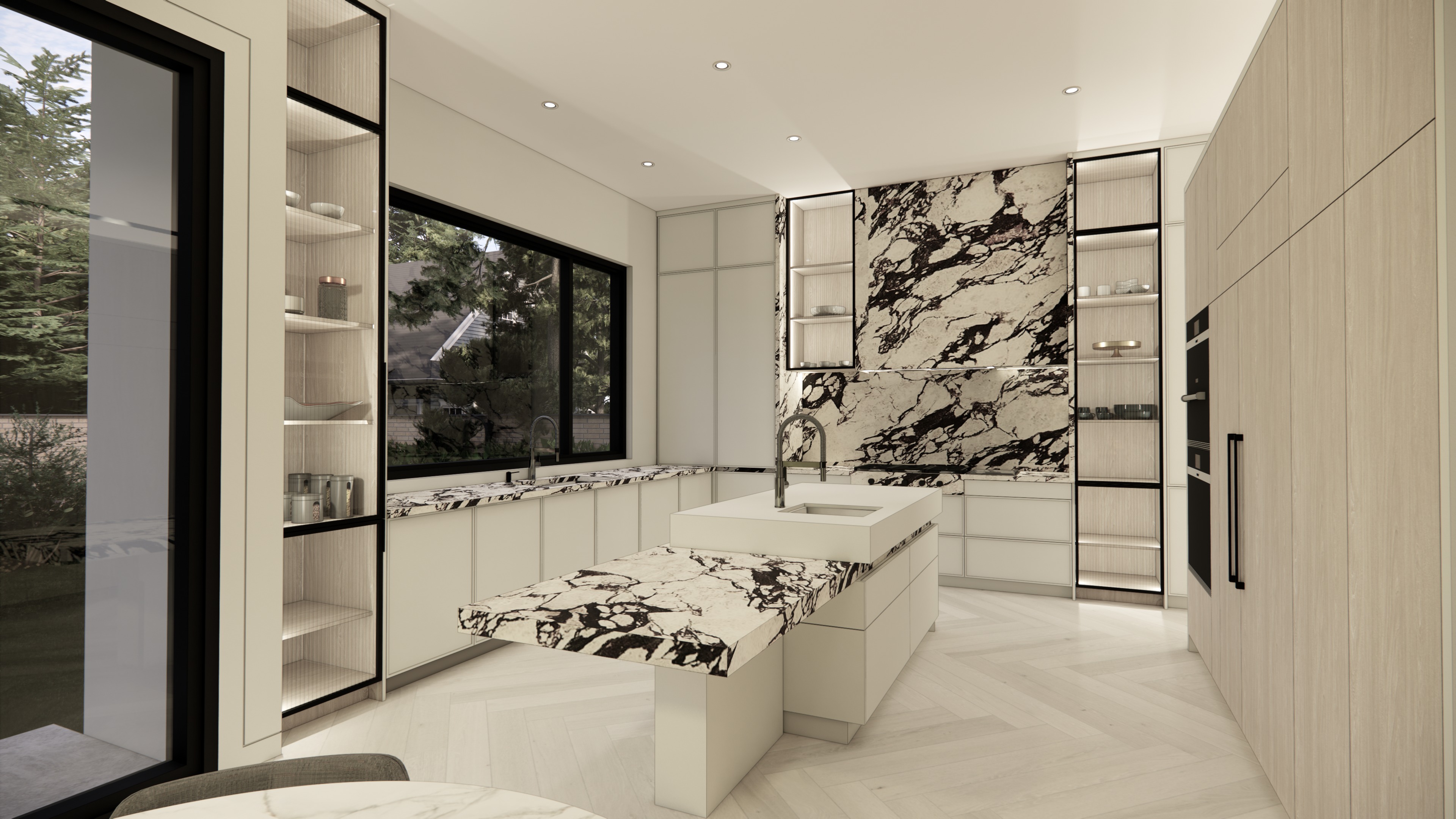 modern kitchen with a minimalist design showcasing a luxurious atmosphere the countertops and backsplash feature a striking white and grey marble pattern cabinets are elegant in matte cream contrasting wi natural light white oak wood tones of the surrounding floor and wall panels large black framed windows allow in natural light enhancing the space with a serene airy feel add vertical recessed light inside the displays with tinted and fluted glasses with brush barss frame stainless steel fixtures add a sleek touch natural outdoor greenery is softly visible through the windows bringing a sense of harmony and tranquility to the atmosphere
