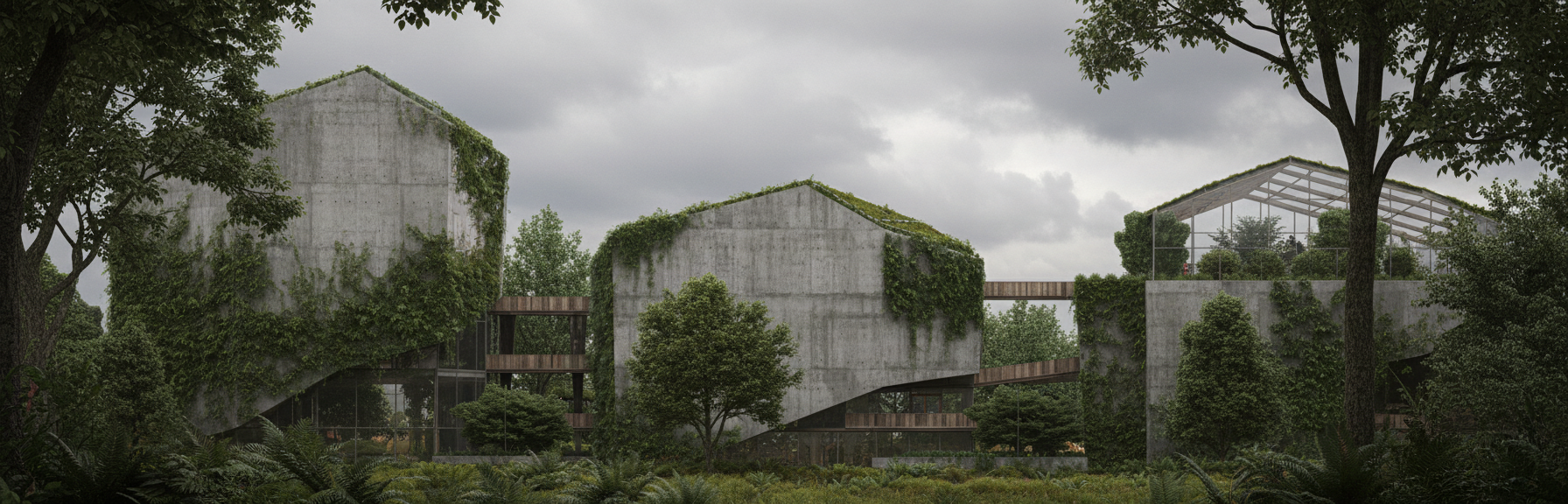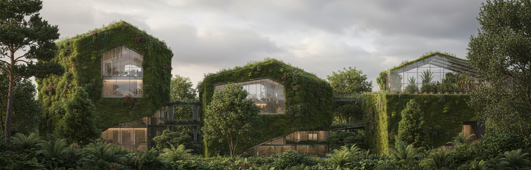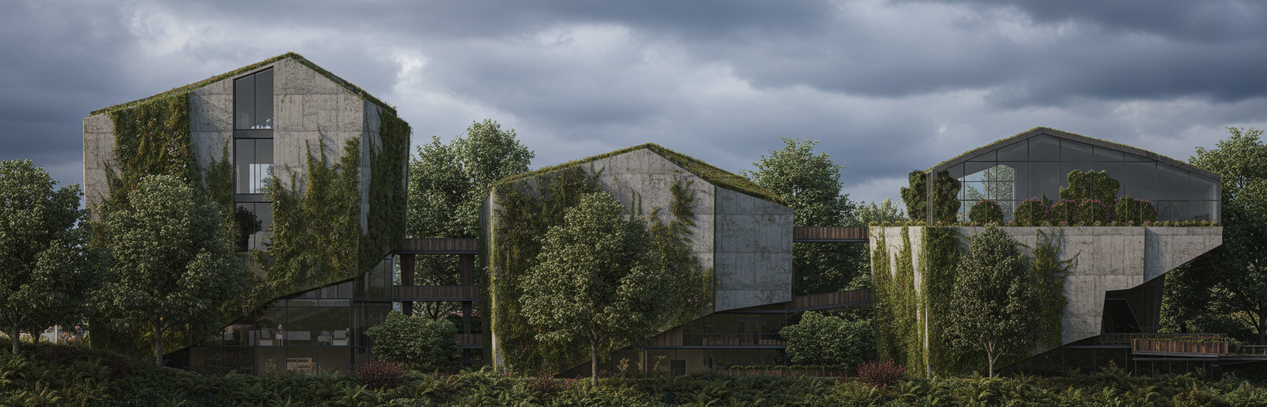 render a modern architectural house with a minimalist design the structure features sleek geometric shapes with a sandy beige facade the large windows are tinted with a dark slate gray providing a contrast accent with a textured natural stone wall on the side the roof and pillars are highlighted in a smooth matte charcoal place lush vibrant green plants in front of the house and on the rooftop garden set the scene on a bright day with clear skies transitioning in a gradient from light blue at the top to a soft pink near the horizon the lawn is vivid green casting subtle shadows to add depth create a calm and serene atmosphere emphasizing simplicity and elegance