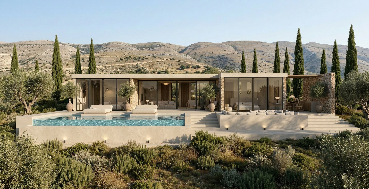add few trees and vegetation to give context and cream interior warm lighting maintain all textures