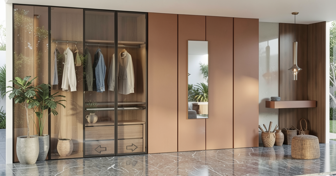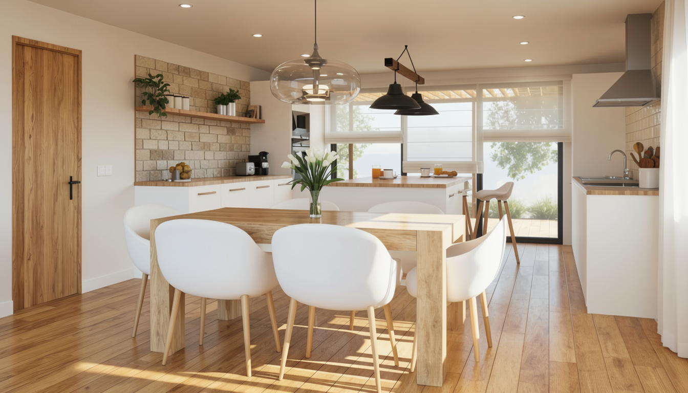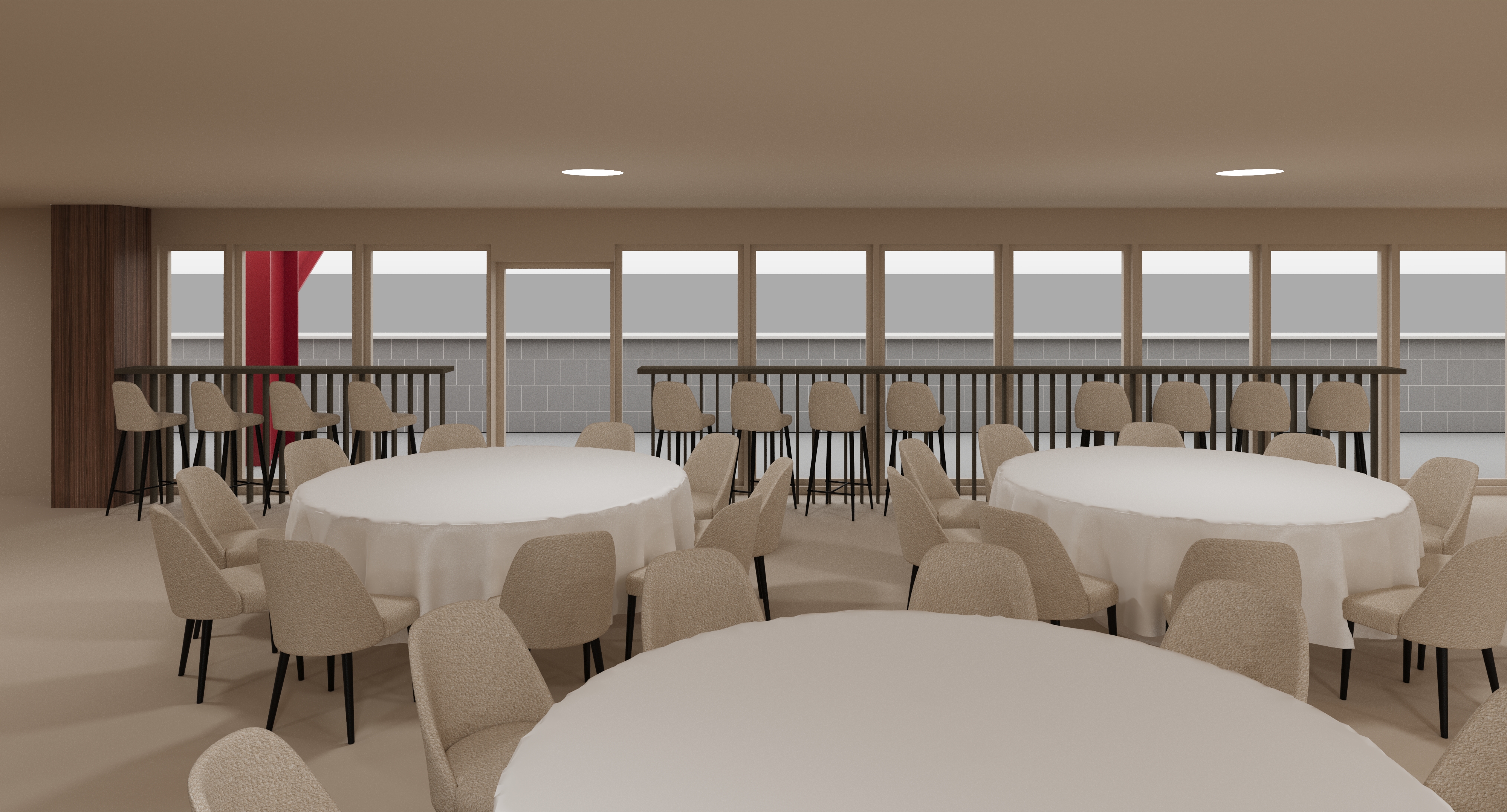 exterior shot using the provided image as input generate a photorealistic interior render that combines the mood board left side for materiality and atmosphere with the clay model right side as the exact spatial layout reference follow the clay model precisely a stadium lounge with a long bar aligned along a full height window wall evenly spaced bar stools and multiple round dining tables with chairs arranged in the foreground and midground maintain the same camera angle proportions and spatial composition apply the mood board s design language warm neutral palette light wood finishes soft beige upholstery refined modern detailing vertical wood slat partitions and minimal elegant decor introduce dramatic lighting strong directional sunlight entering through the large windows casting long defined shadows across the floor and furniture high contrast between light and shadow to emphasize depth and form warm interior accent lighting recessed ceiling lights and subtle ambient glow to create contrast with cooler daylight slight golden hour tone for richer warmth and atmosphere highlight key architectural elements like the bar partitions and table groupings with focused light falloff replace clay materials with realistic finishes smooth stone bar top upholstered seating wood paneling and polished flooring with soft reflections ensure the stadium view is visible but slightly blown out or softened to prioritize interior lighting contrast style cinematic high end architectural visualization camera wide angle eye level shot mood dramatic atmospheric premium hospitality environment focus strong light shadow interplay material realism accurate layout replication
