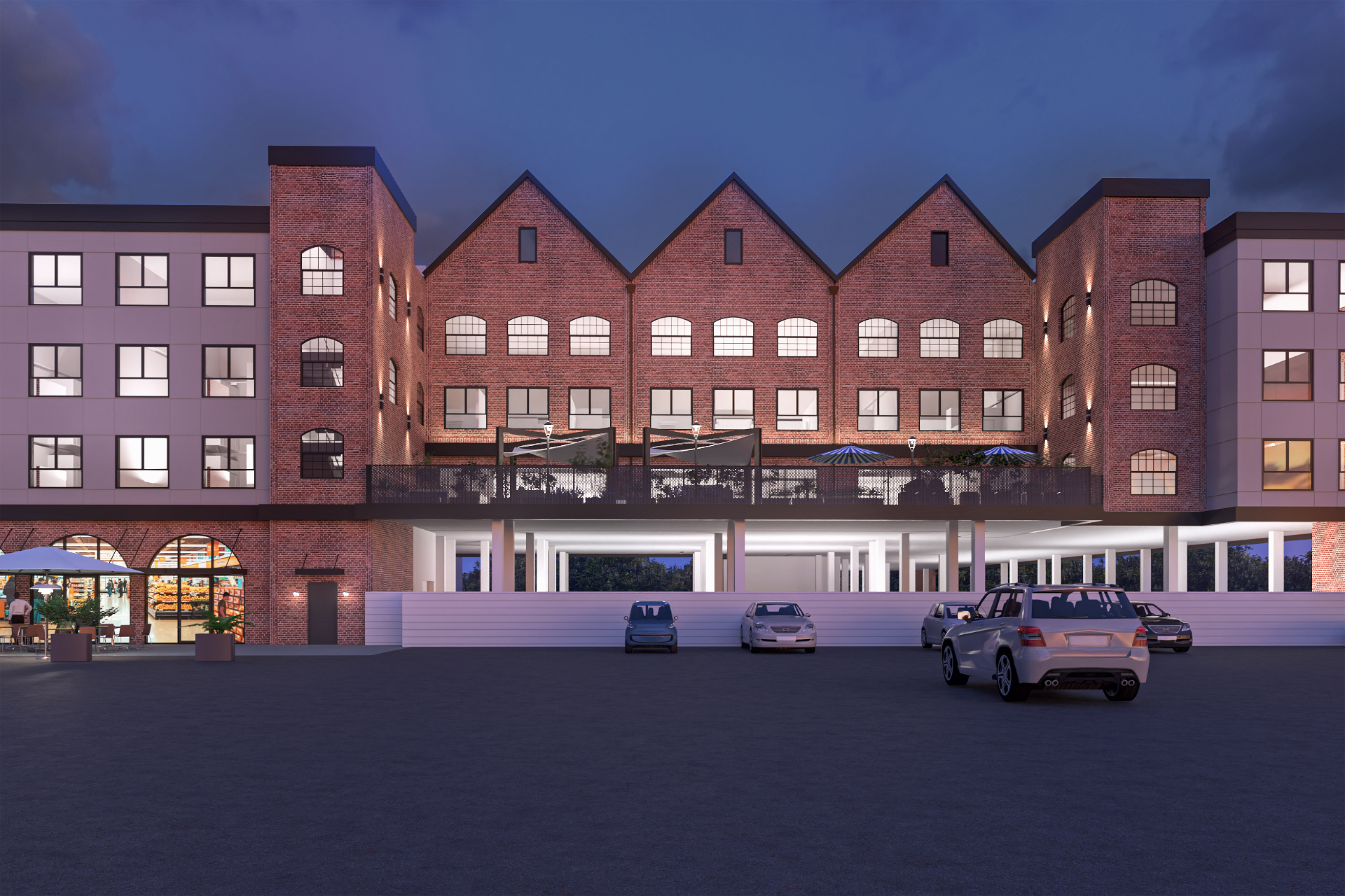 create a beautiful architecture magazine worthy image of this building keep colors textures and existing elements show cars people eating outside and a lively ambiance winter wonderland