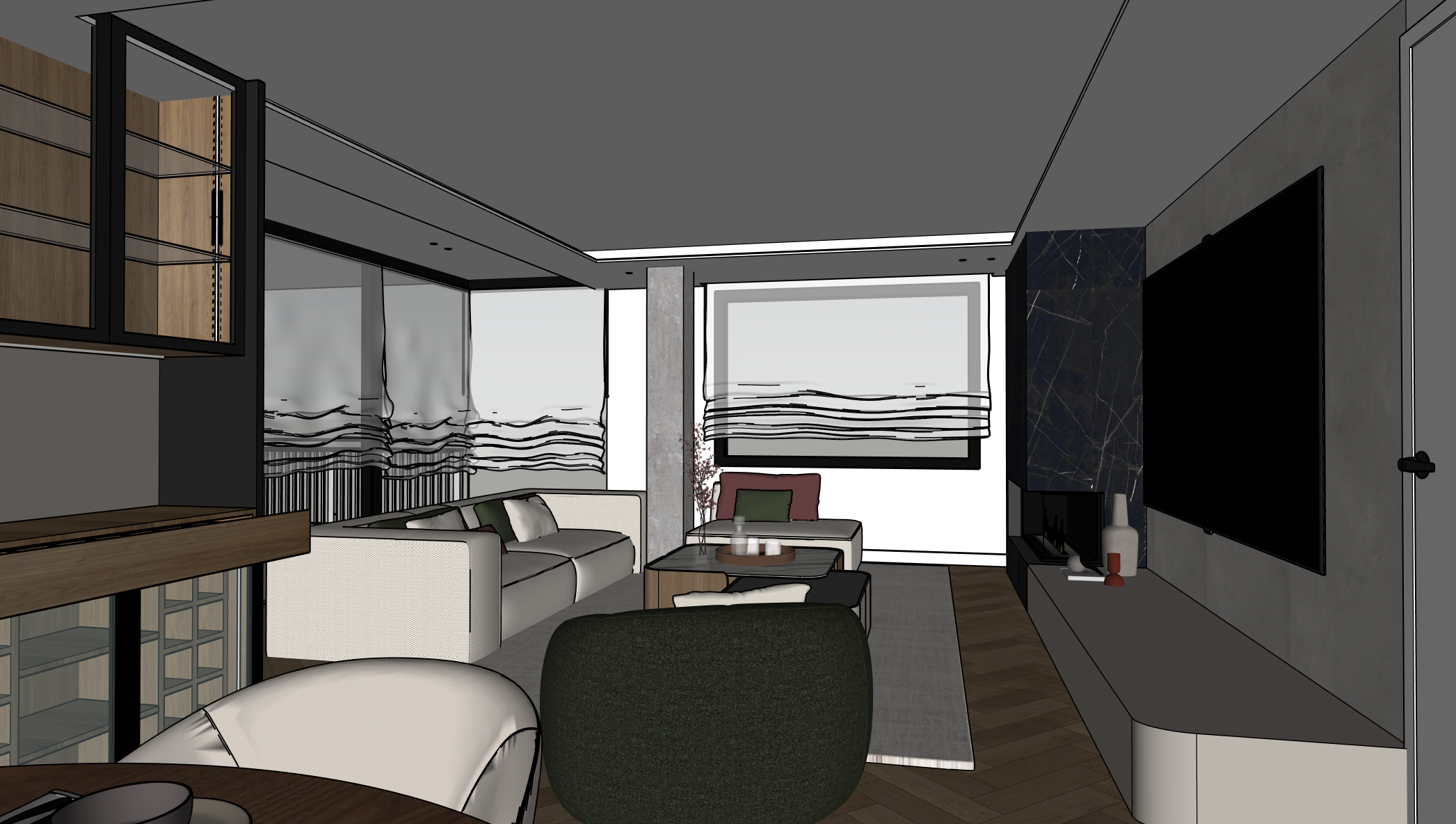 por favor genera una imagen fotorealista mejora texturas y elimina el ruido no modifiques el mobiliario elimina el jarron beige y naranja que hay en la zona de tv e mueble que tienes a la izquierda de madera es un mueble bar por lo que a ade decoracion relacionada con un mueble de ese tipo elimina la lampara que has puesto en el centro del techo