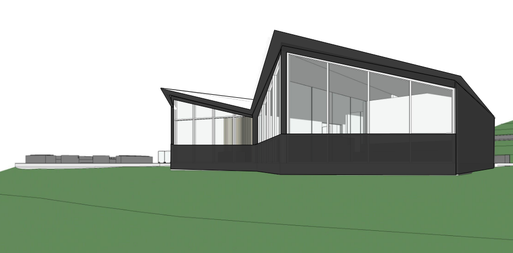preserve building geometry and proportions harden edges to keep realistic do not redesign structure modern bathouse spa welness centre with internal spa saunas and ice baths dark burnt cladding black vertical charred timber cladding matte finish slim black aluminium frames concrete fire pit in distance smoke and warmth coming from fire glazing should show tinted exterior reflections with subtle warm interior glow only to take away from unfinised interior interior not fully visible maintain positioning of internal finishes only adapt colour natural warm tones earthy retreat landscape hierarchy low native grasses near villa only pathway lighting positioned evenly along path edge only no random scattered lights vineyard rows clearly in mid to far background distant tree line on ridge time of day late blue hour getting darker soft glaze soft sky gradient controlled lighting realistic shadow depth premium winery retreat mood negative no added furniture no dramatic spotlighting no suburban garden styling no cinematic overexposure