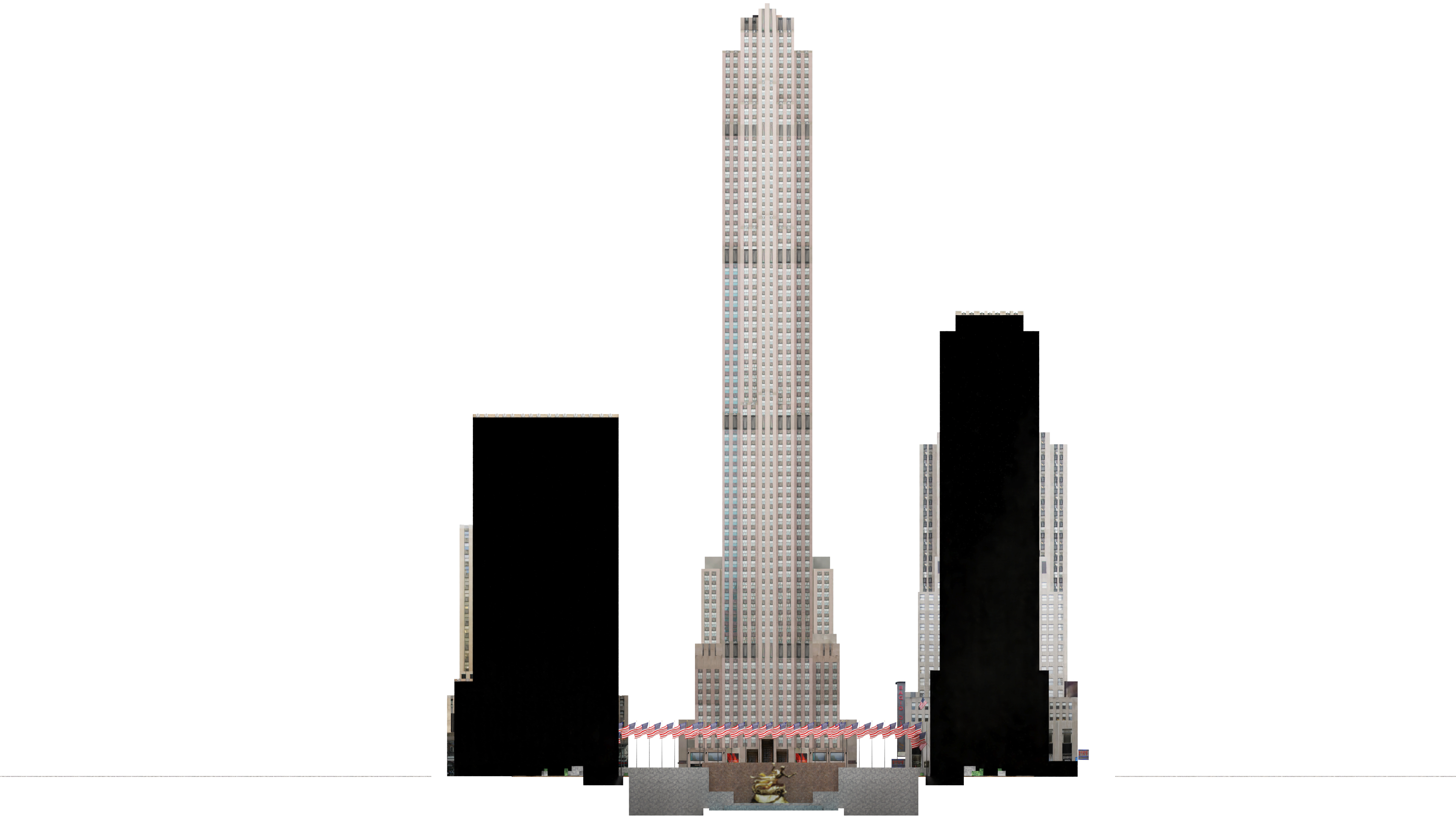 preserve the exact composition massing scale and layout of the provided base image entirely do not alter the central 30 rock tower keep its limestone art deco facade full height and position exactly as shown the flanking buildings currently shown as solid black silhouettes should be revealed as architectural section cuts exposing their stacked interior office floors show realistic class a office interiors within those exact black silhouettes only warm lighting open plan workspaces elevator cores mechanical plenums the white background plaza flags and prometheus statue at base remain unchanged full panoramic width preserved this is a section elevation of the entire rockefeller center complex not a close up of a single building