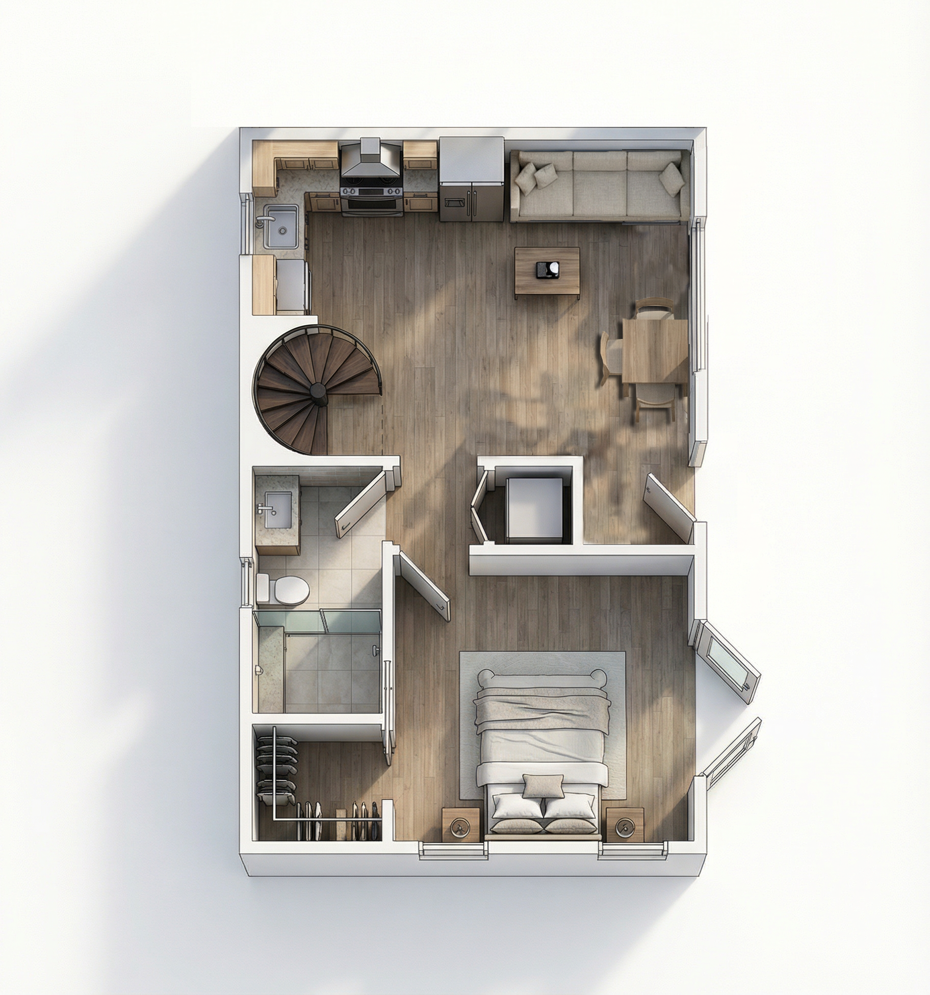 convert this floor plan into a realistic isometric 3d view of a full house show the space from an elevated angle with furniture walls and details visible keep the floor plan same use the same furniture as shows on the plan do not change the orientation of the floorplan