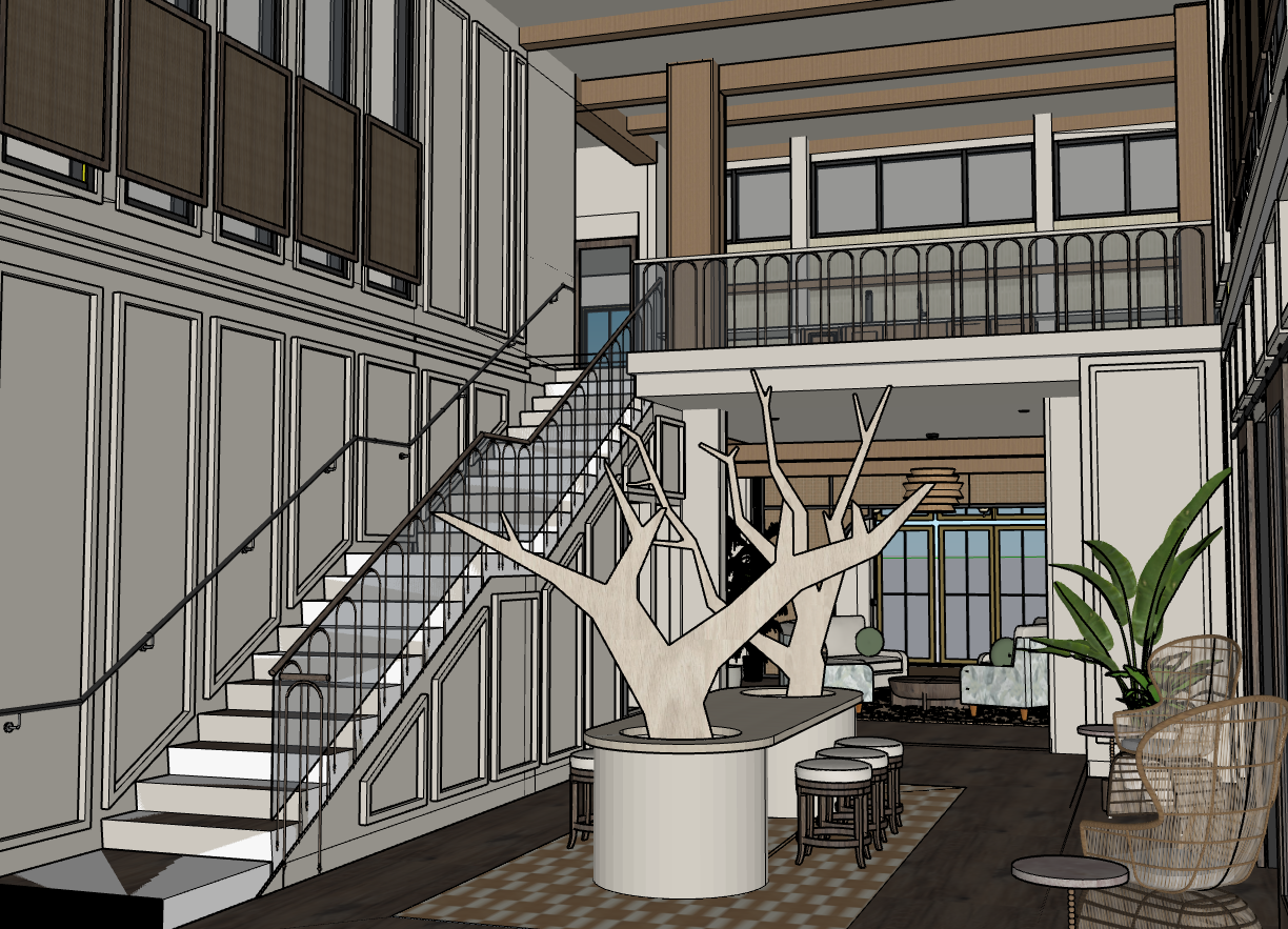 interior lobby with tambour table base planters tile inlay under in ivory and tarricotta colors with lots of natural lighting throughtout