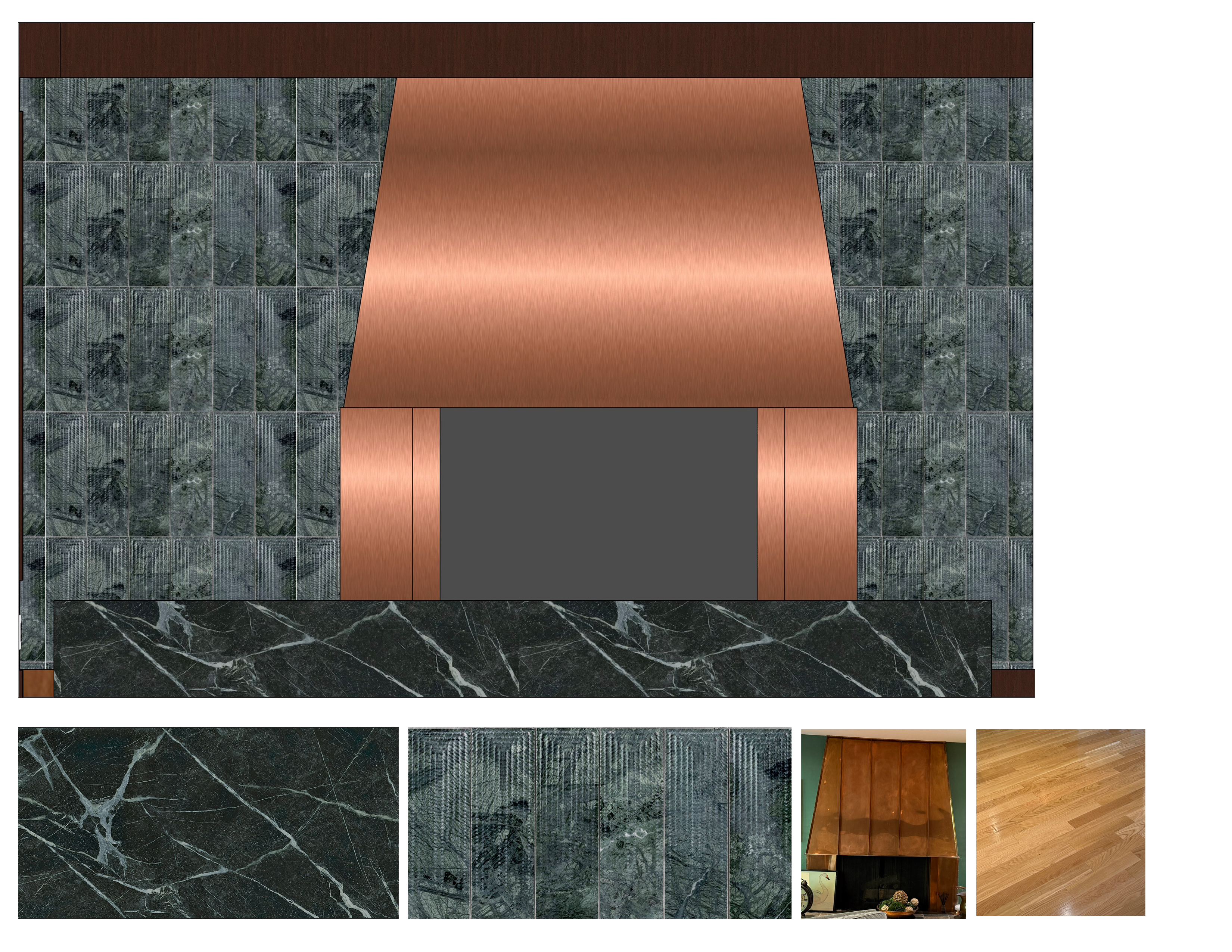 generate a photo realistic image in bright day time natural lighting soft shadows space is evenly low lights and using the materials below on the board for reference and the wood floor giving a front floor only and the cooper mantel photo for the mantel with a warm fire in the fireplace