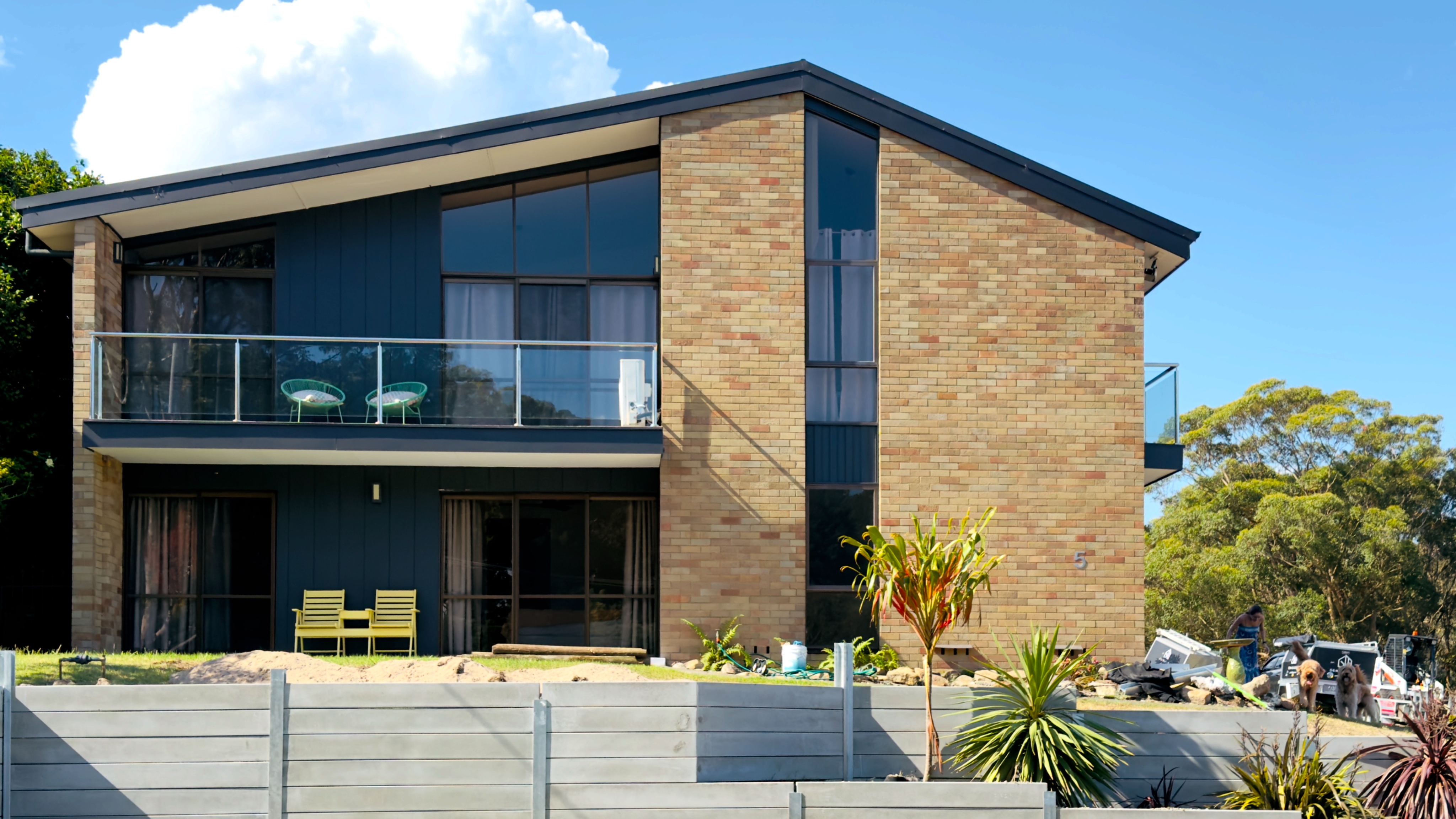 a light costal timber batten fence sitting directly on top of the concrete sleep retaining wall seen at the bottom od the photo