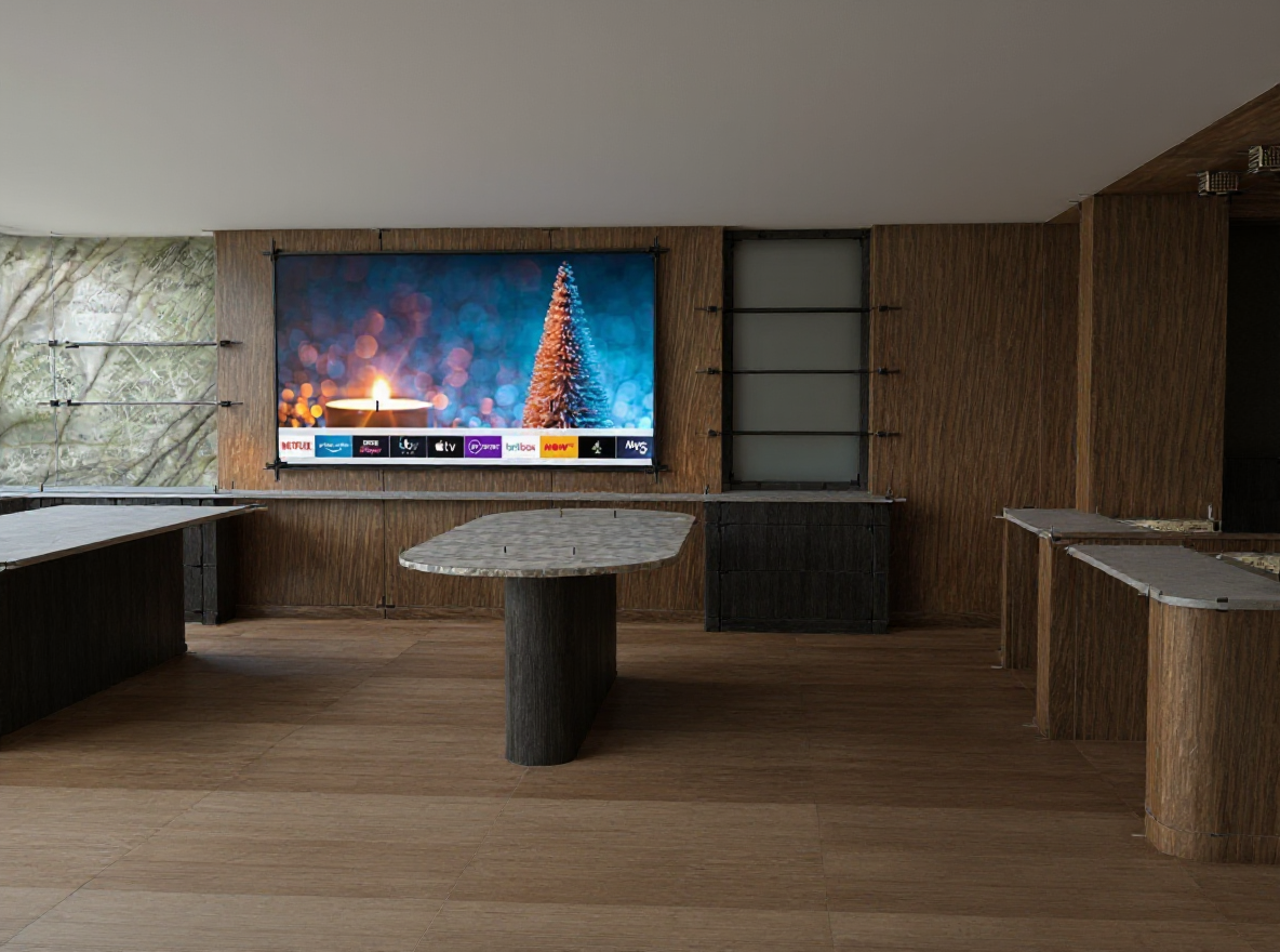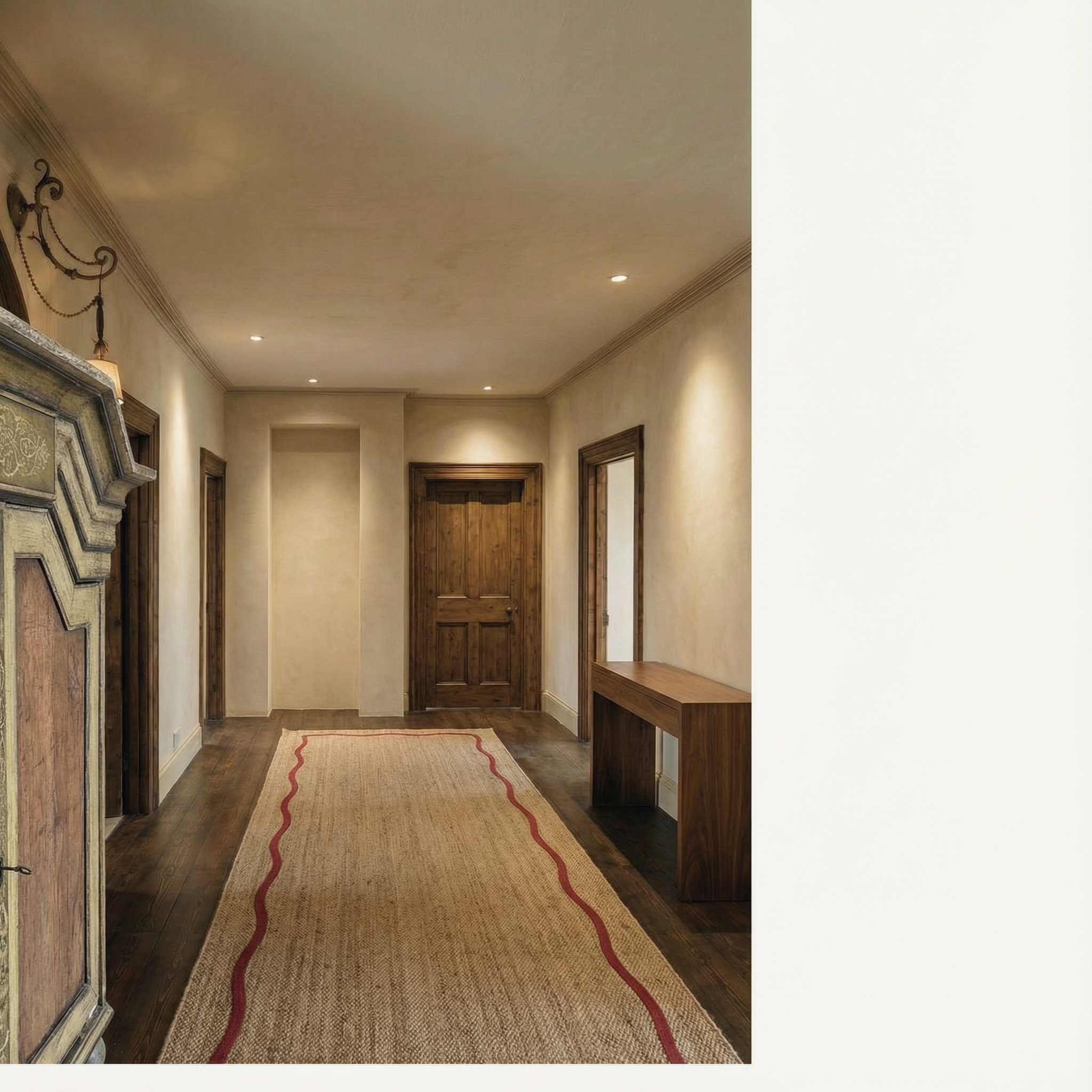 can you make this cupboard appear jsut in shot on the right of the image at the end of the corridor can you create a full height recessed niche to the left of the door with a wall thickness of 30cm between the door and the niche and no skirting on the bottom create a jute runner with a slim wavy red inset border the length of the hallway the hallway walls are lit by discrete plastered in recessed downlights place a modernist console on the left wall between the two doors with no styling