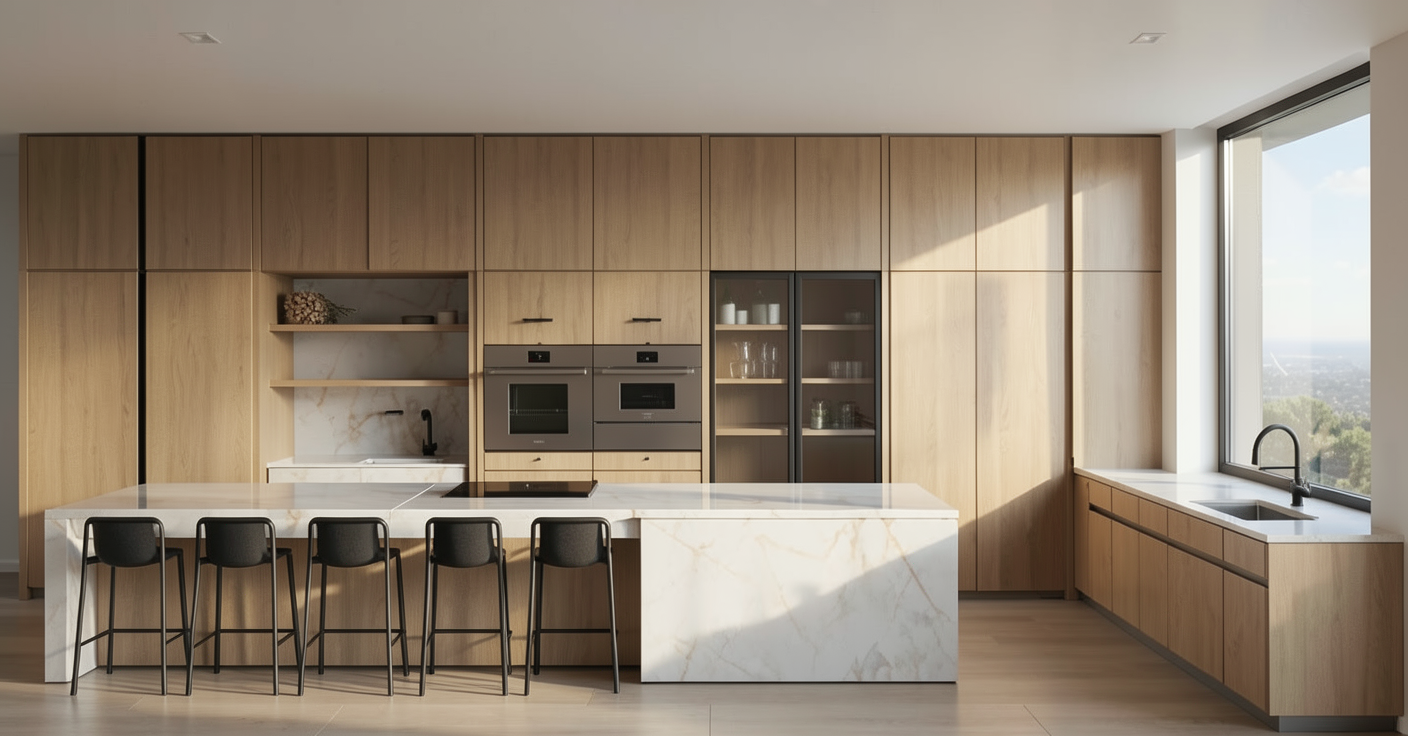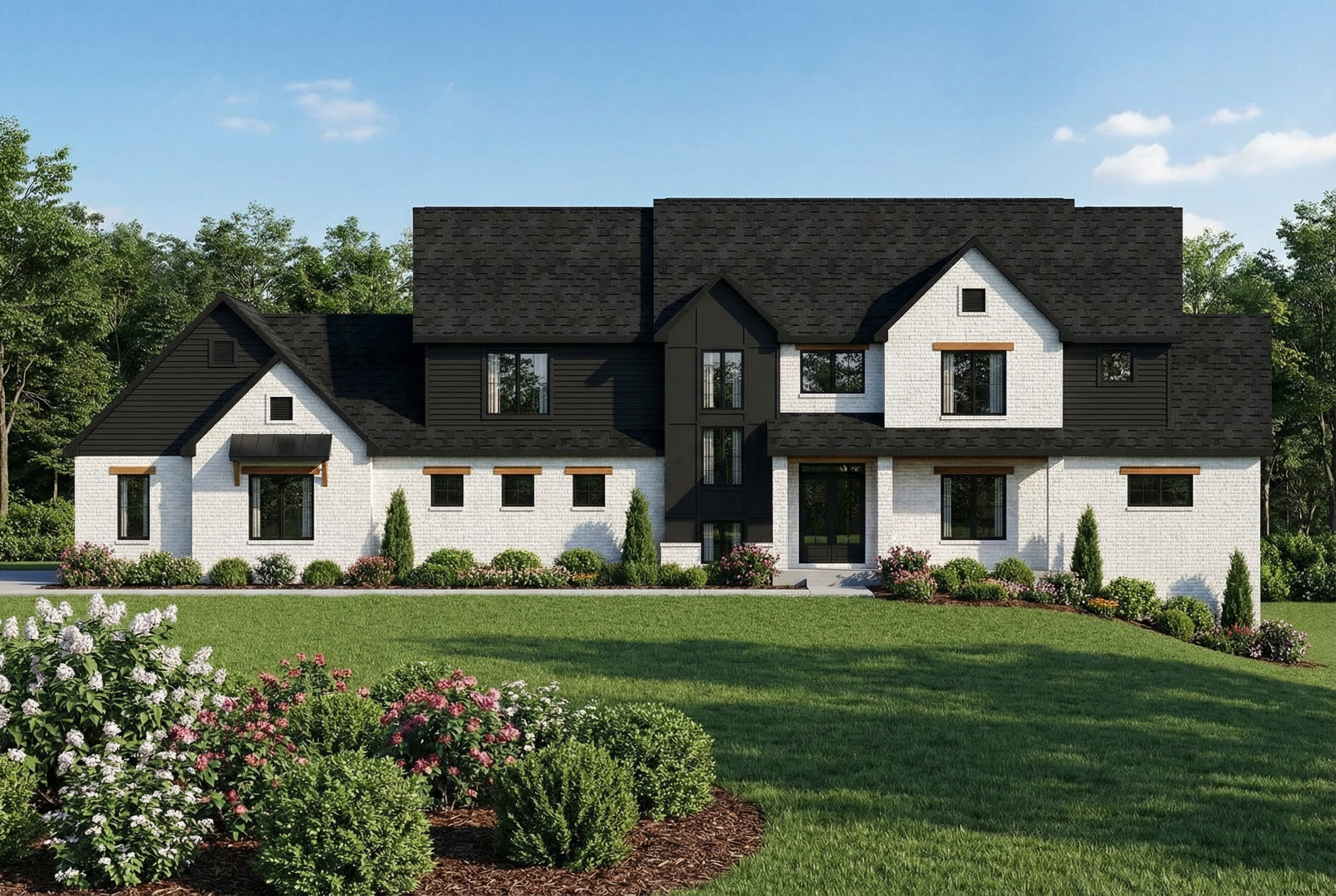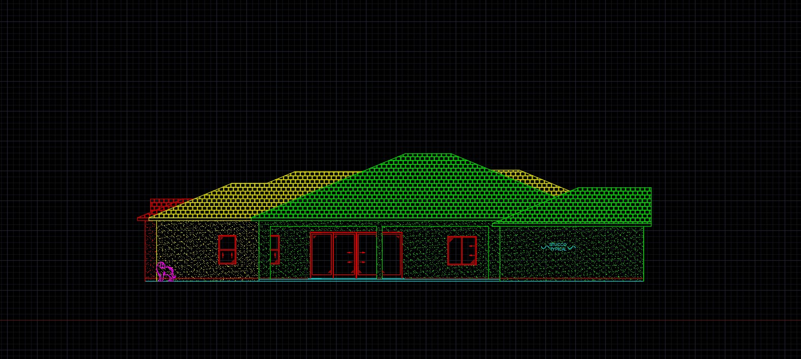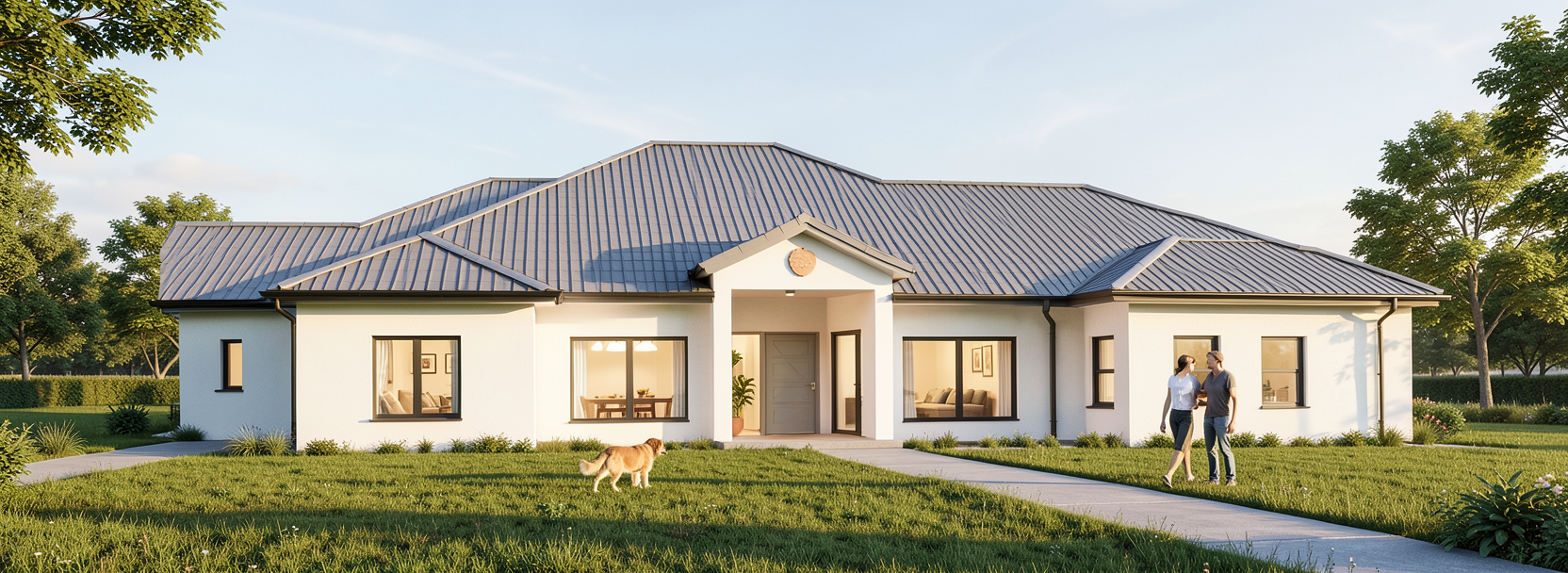 generate a beautiful front elevation render with light inside white stucco on the front walls and a gray flat tile roof modern exterior elevation in an open field with grass a sidewalk along the front of the house and one dog and two people