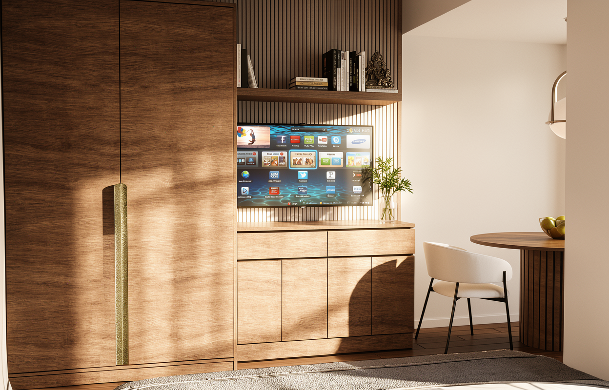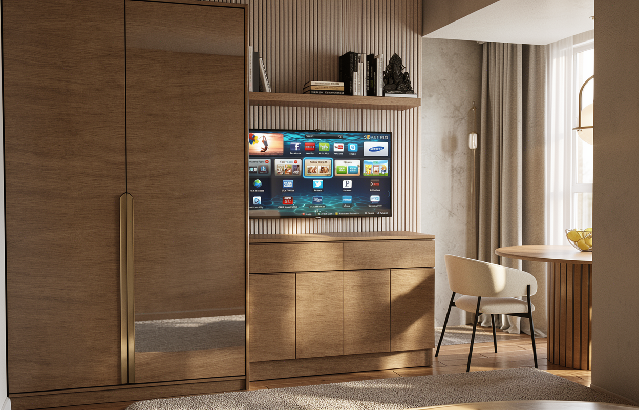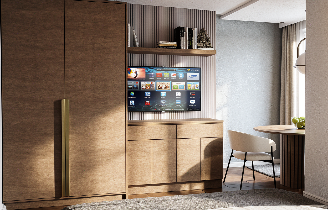 lights on floating shelves with led light under vacant wall into floor to ceiling mirror