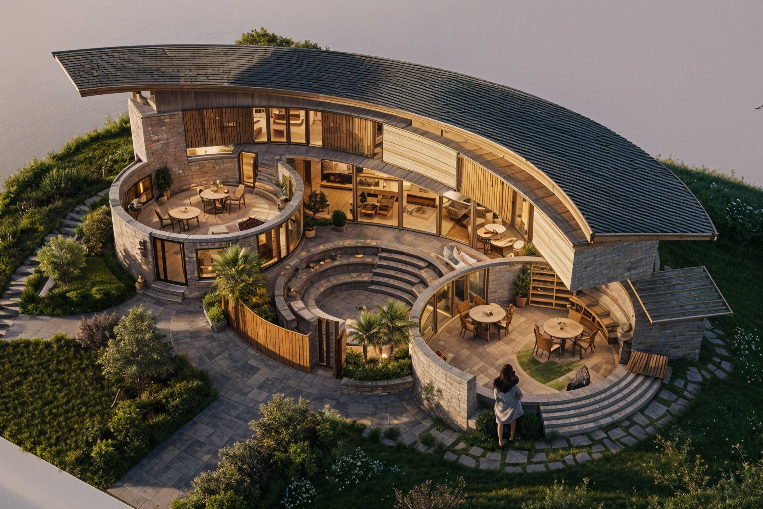 aerial shot use wood stone concrete material coziness and greenery set in the evening with soft gentle sunlight make it a community center make roofs curvy concave