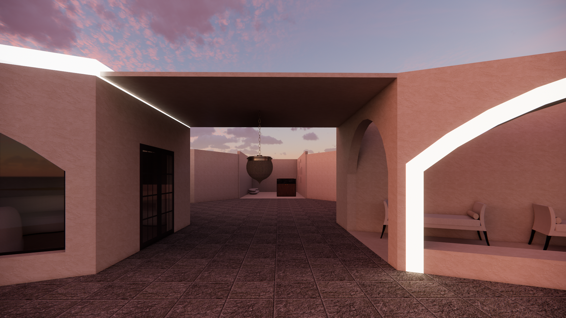 a high end caf and hookah lounge interior in djibouti asta studio preserve the existing layout materials and mood exactly including the wood accented ceiling soft beige plaster walls woven pendant lamps natural light and custom wood furniture the design should remain unchanged only enhance the lighting realism atmosphere and visual richness the space includes comfortable booth seating along one wall and light wood tables with rattan chairs at the center behind the booths keep the vertical wooden branch wall feature that adds rhythm and warmth through the arched openings maintain a view toward venice road djibouti with a glimpse of the marina and sea water reflections in the distance add elegantly designed hookahs placed on some tables modern forms with glass bases metallic stems and subtle decorative hoses that blend seamlessly into the aesthetic they should enhance the lounge atmosphere without feeling cluttered or overly ornamental lighting create a cozy evening ambiance with soft amber tones warm ceiling lights and diffused glow from the woven pendants accent lighting should gently emphasize material textures the plaster wood and cane creating depth and comfort subtle reflections on the floor and glass surfaces evoke a high end inviting mood the overall feeling modern arabic luxury infused with natural warmth a tranquil elevated environment where contemporary design meets cultural comfort keep every design element intact while enriching lighting material depth and atmospheric storytelling