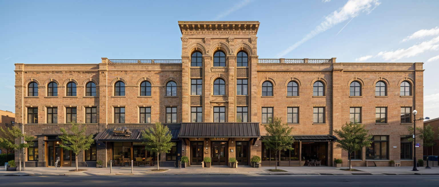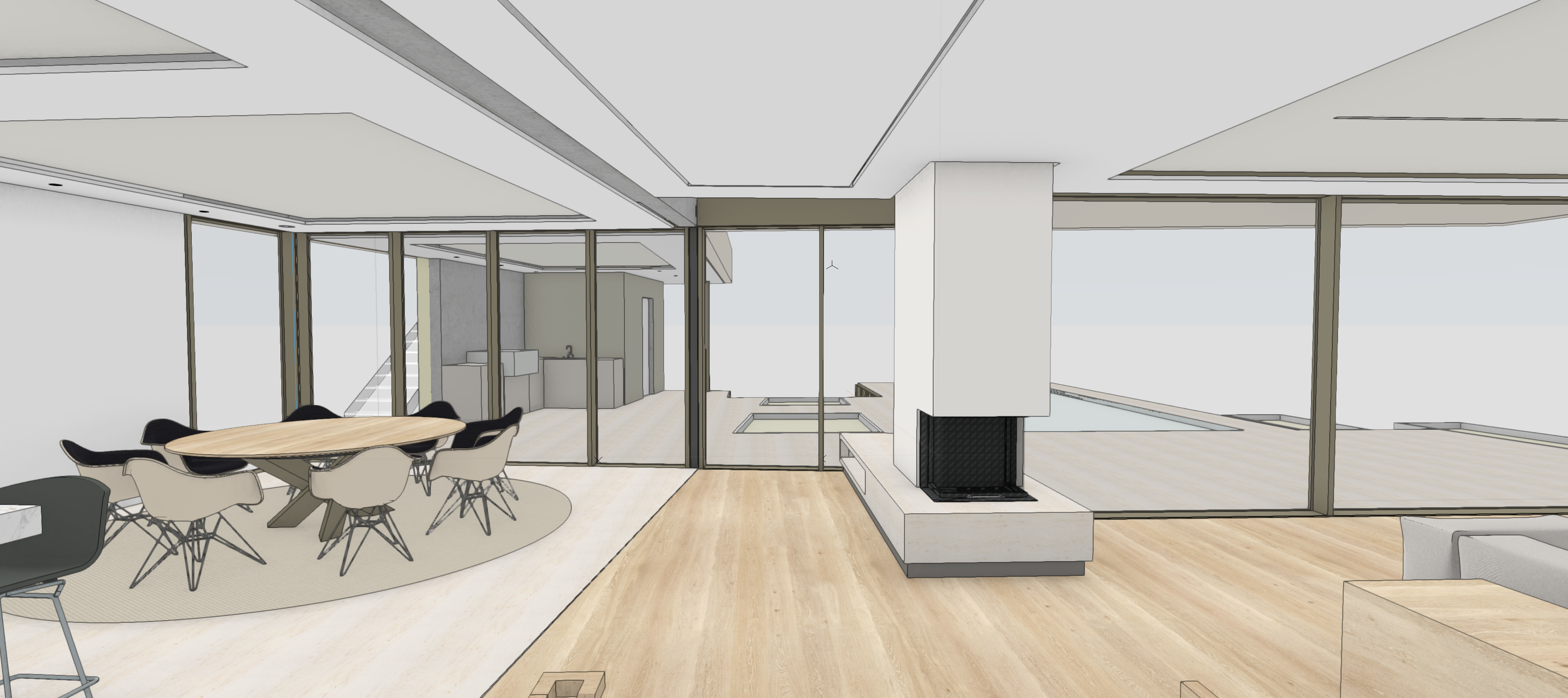 modern dining and kitchen area minimalist design with a warm atmosphere light natural kanfanar stone floor on the left and light oak floor on the right contrasted by dark fireplace in the middle also surrounded by the light natural kanfanar walls in a soft cream color with large glass windows framed in dark bronze ceiling features recessed lighting in a subtle white tone dining chairs are a mix of beige and black with sleek metal legs arranged around a round light oak table on a beige textured rug inviting and elegant ambiance with natural light streaming in enhancing the earth toned palette