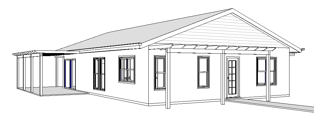 zinc corrugated steel roof rendered walls timber windows timber pergola timber panelling to gable pavers to paths lawn garden trees in background