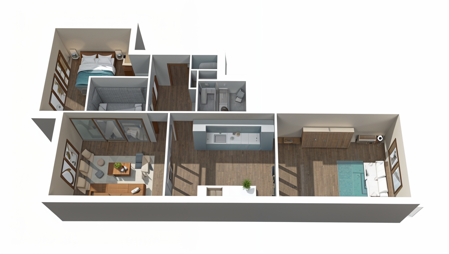 make a modern and realistic interior visualisation save details add two round fluffy carpets make architectural concrete on walls the glass in front centre is textured with vertical stripes the floor and wall on the right side is made of soft travertine