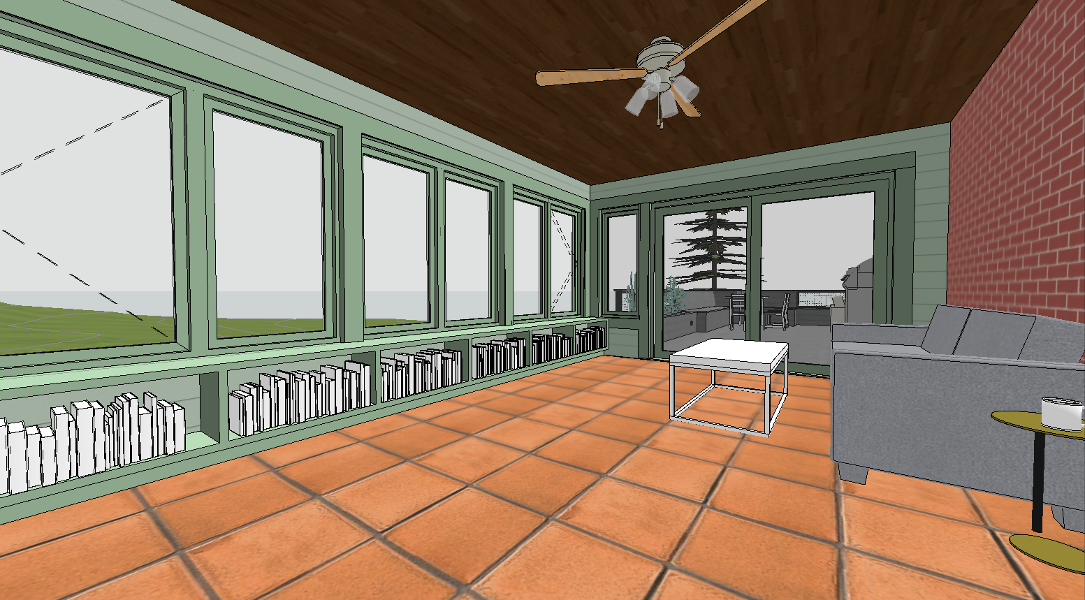 photographic image with smooth terracotta tile floor deep green shiplap walls green windows pine tongue and groove ceiling