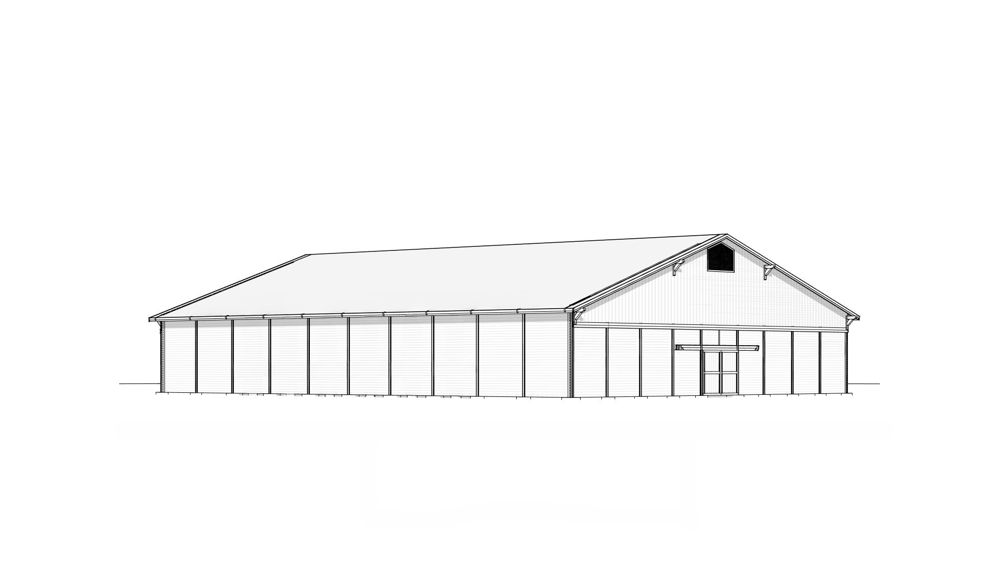 clean equestrian horseback riding arena architectural open air exterior arena rendered in cinematic golden hour lighting with blue skies and vibrant clouds enclosed horse arena in a lush beautiful forest setting with green grass and dense trees surrounding the property select grade horizontal cedar siding on the lower part of the structure and douglas fir board and batten on the upper portion of the arena green manicured landscape around structure with gardens and grass black standing seam metal roof high fidelity photorealistic visualization crisp shadow falloff refined facade geometry soft atmospheric depth premium architectural photography mood ultra clean composition and materials photorealistic render prominent trees scattered around the property black posts black trim around wood barn doors lower and upper sides of the structure have horizontal cedar wood siding