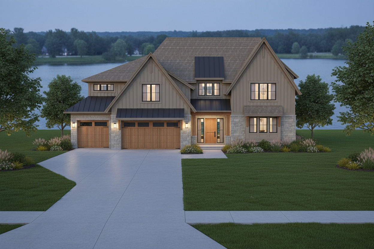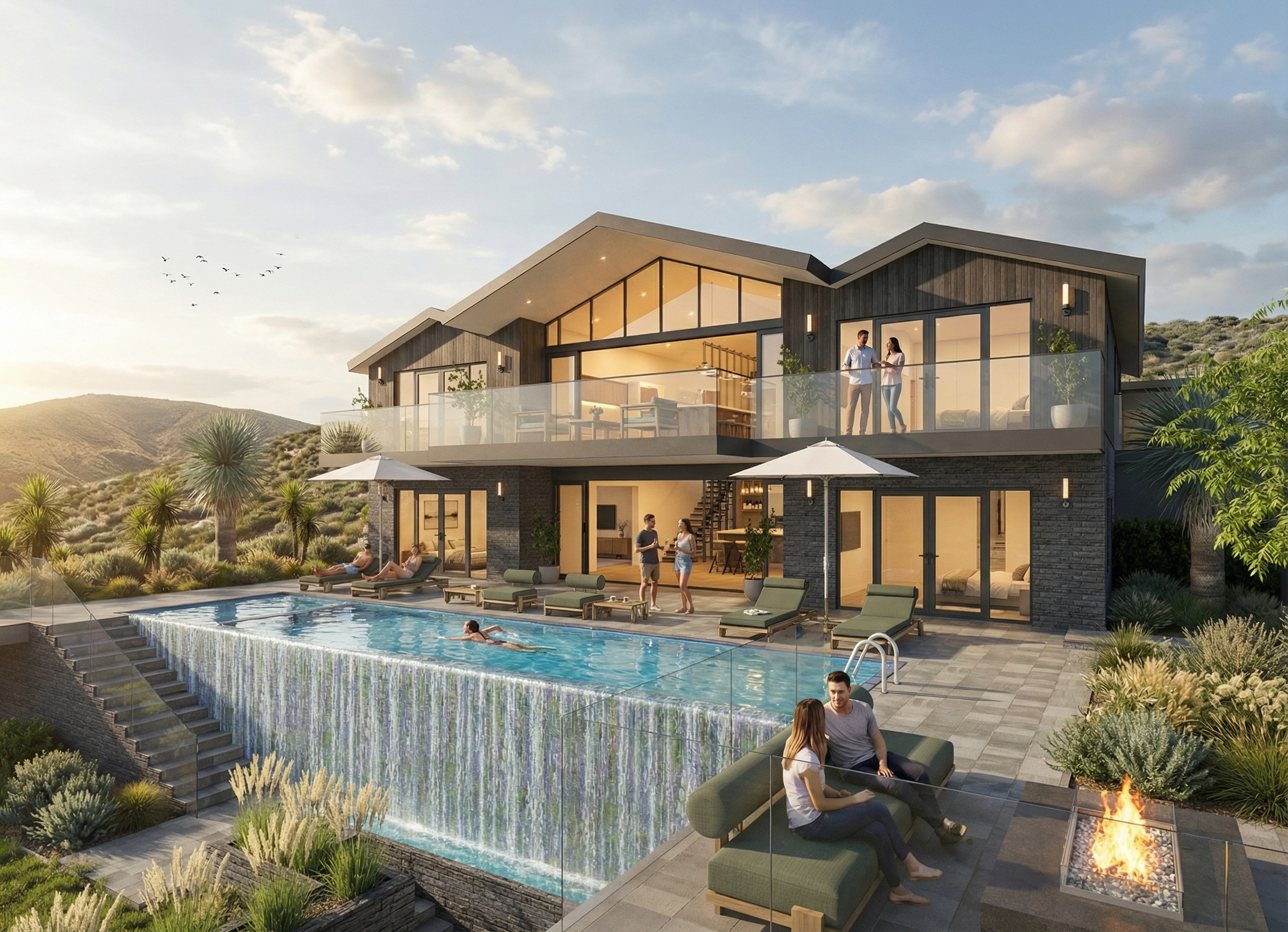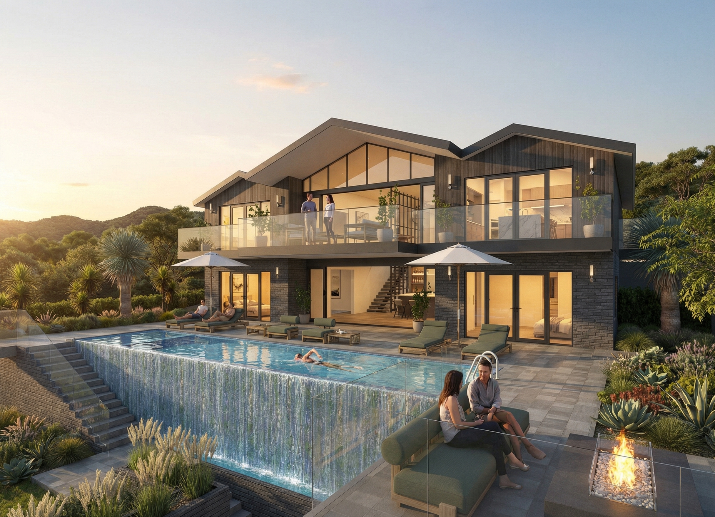 afternoon lighting with some lights on inside the house add a waterfall effect to the infinity edge of the swimming pool add plants and grasses and trees native to malibu california and on the hills in the distance add some two people sitting on the sofa by the fire pit make the wind guard on the fire pit glass add a man and woman standing on the balcony add a woman swimming laps in the pool add some people on the chaise lounges and around the pool the upper right space inside the french doors is the kitchen with an island in the center of it make the lower story of the house dark gray narrow roman bricks material add 2 people standing the center space on the pool level standing and having drinks add some birds flying the sky and a few clouds