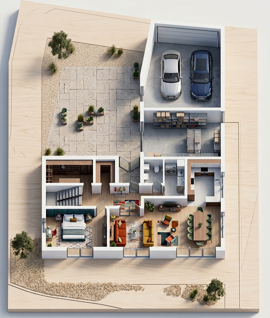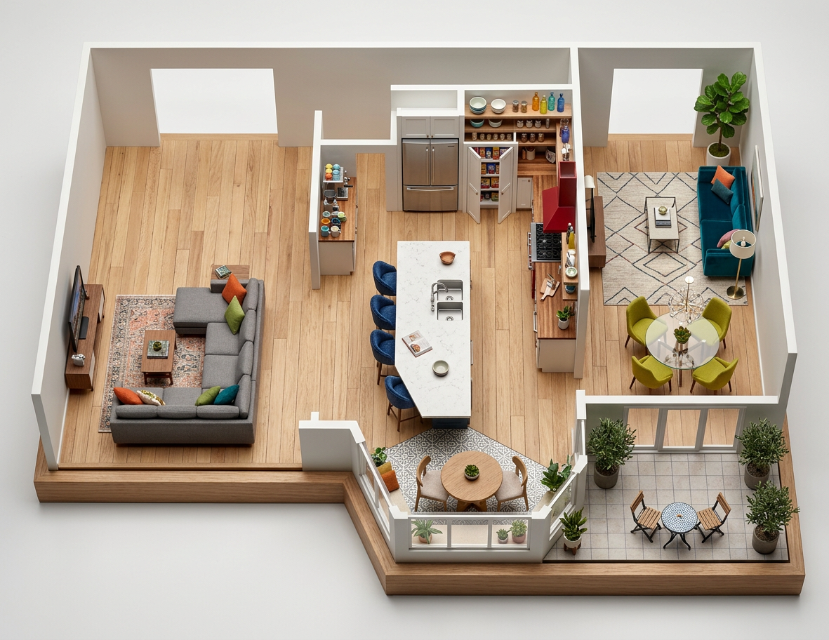 editorial hyperrealistic interior living room scene maintaining the exact composition camera angle and warm sunset lighting refine realism coherence and material accuracy subtle poetic lived in atmosphere floor replace flooring with traditional rectangular wooden plank flooring strip flooring planks must run parallel to the window natural oak tone matte finish subtle variation between planks no herringbone pattern coffee table keep mirrored finish maintain a single ceramic coffee cup with realistic proportions not oversized cup should feel grounded correct shadow and reflection avoid floating appearance sofa styling keep only two cushions on the end closest to the pendant lamp back cushion 50x50 cm desaturated burgundy and off white stripes slightly softer contrast front cushion smaller plain off white cushion ensure correct scale and natural compression against the sofa basket behind sofa only one woven basket with blankets must be subtly visible from the side closer to the window do not let it protrude beyond the sofa edge it should gently peek out just enough to reveal spatial depth between sofa and wall rug maintain ikea stockholm style reduce edge thickness borders must be thin and natural not visually heavy exterior critical correction the man must be clearly visible and well defined seen from the back wearing red shorts and a white t shirt talking on the phone improve anatomical realism correct proportions legs posture ensure feet are properly grounded on the exterior floor no floating or distortion slight depth separation from background but still sharp and readable garden exterior depth reinforce that it is a private ground floor garden add clearer sky presence above the wall improve tree definition and natural lighting continuity lighting refinement maintain warm sunset light pendant lamp 3000k improve light balance avoid overexposed window and flat interior shadows increase contrast slightly for editorial depth ensure physically accurate reflections on glass and mirror materials realism global correction improve corduroy directionality on sofa visible ribbing correct scale enhance walnut grain on armchair and cabinet improve curtain fabric weight and fall slightly heavier more natural folds remove cgi noise grain artifacts clean but still photographic walls and baseboards off white paint with very subtle gray undertone baseboards in the same color clean and continuous overall style cinematic poetic editorial interior photography architectural digest elle decor level ultra realistic rendering sharp but soft balanced subtle film grain not digital noise high dynamic range natural imperfections
