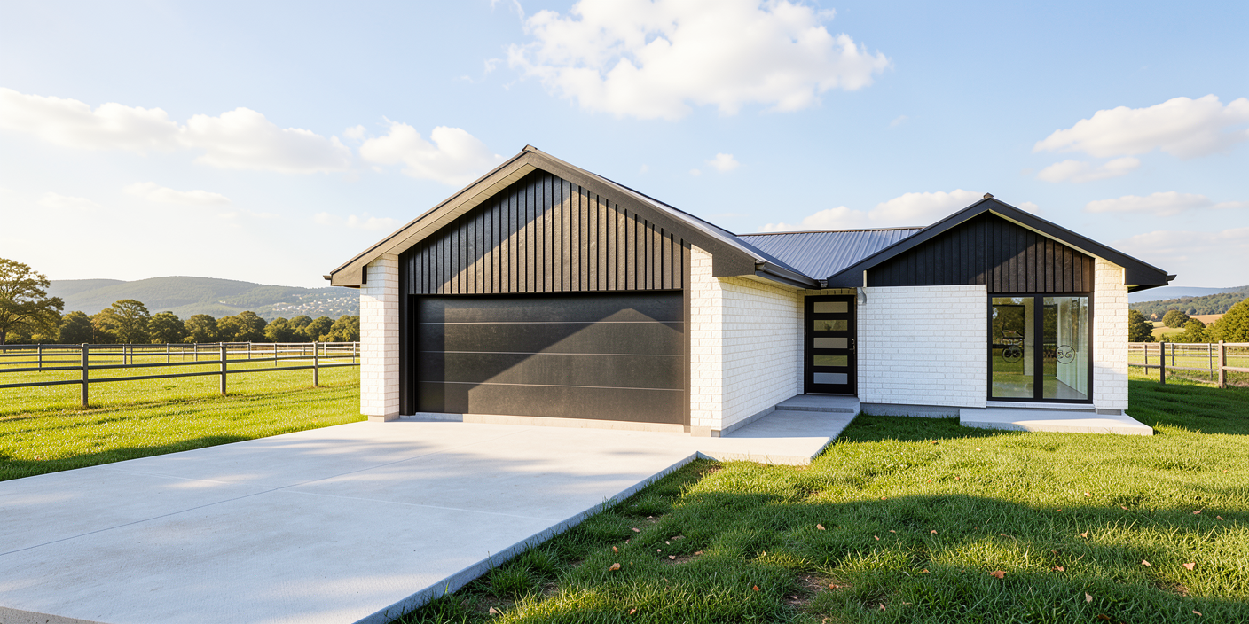 black framed windows contemporary style stucco with modern accents add some mature trees in the background add a walkway to the steps add a driveway to the garage door give the building a modern limestone look add some ornaments add more limestone detail to the building make it early afternoon with a nice sky only make the windows rail and light fixtures look black keep the building and the roof caps a light color also show the brick as noted in a modern darkish black grey tone to fit the theme make the window and door framed in black make the awning above the door black as well make the window trim match the wall material beside it make the flat roof caps light in color