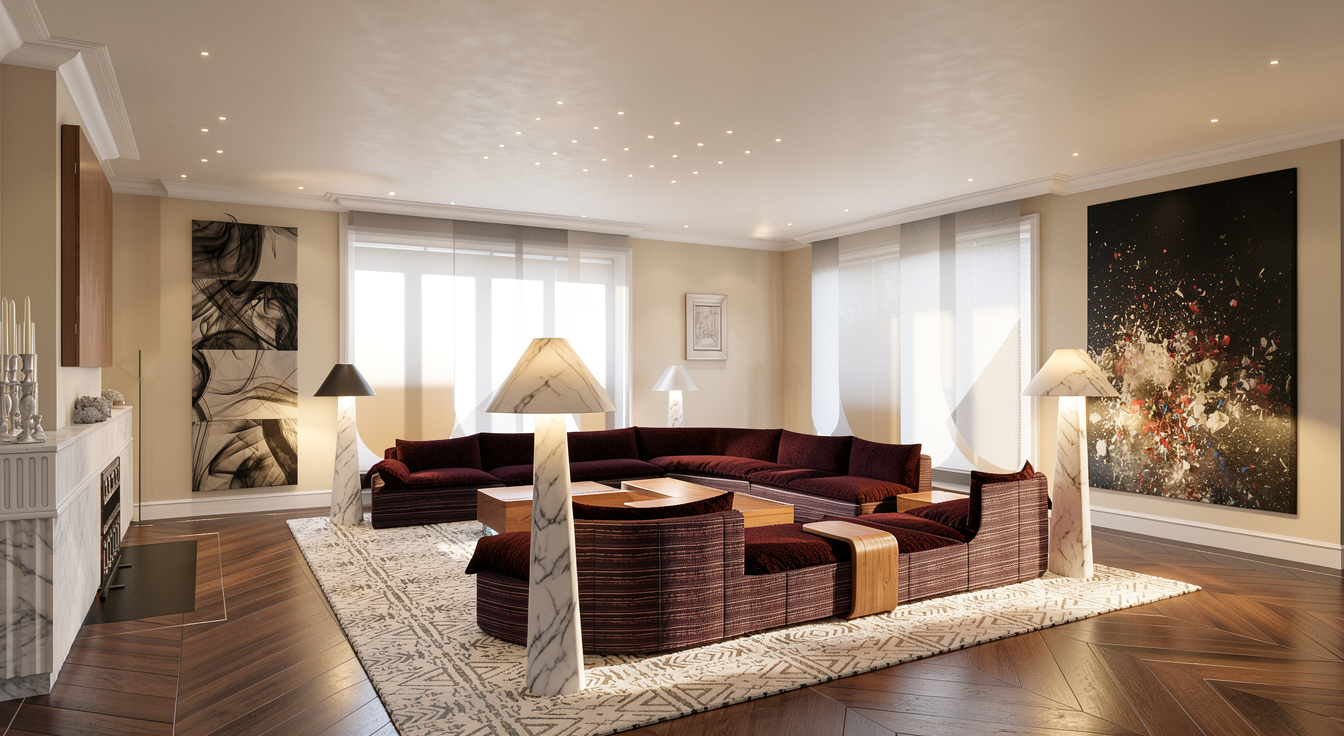 exterior shot generate a 3d rendered architectural top down view from a floor plan very important maintain the exact proportions and respect the volumes and dimensions of the plan do not alter the layout of the provided floor plan harmoniously apply the colors tones and materials featured in the moodboard furnish the rooms with furniture pieces similar to those in the moodboard create multiple light sources to illuminate the space in a soft and luxurious manner
