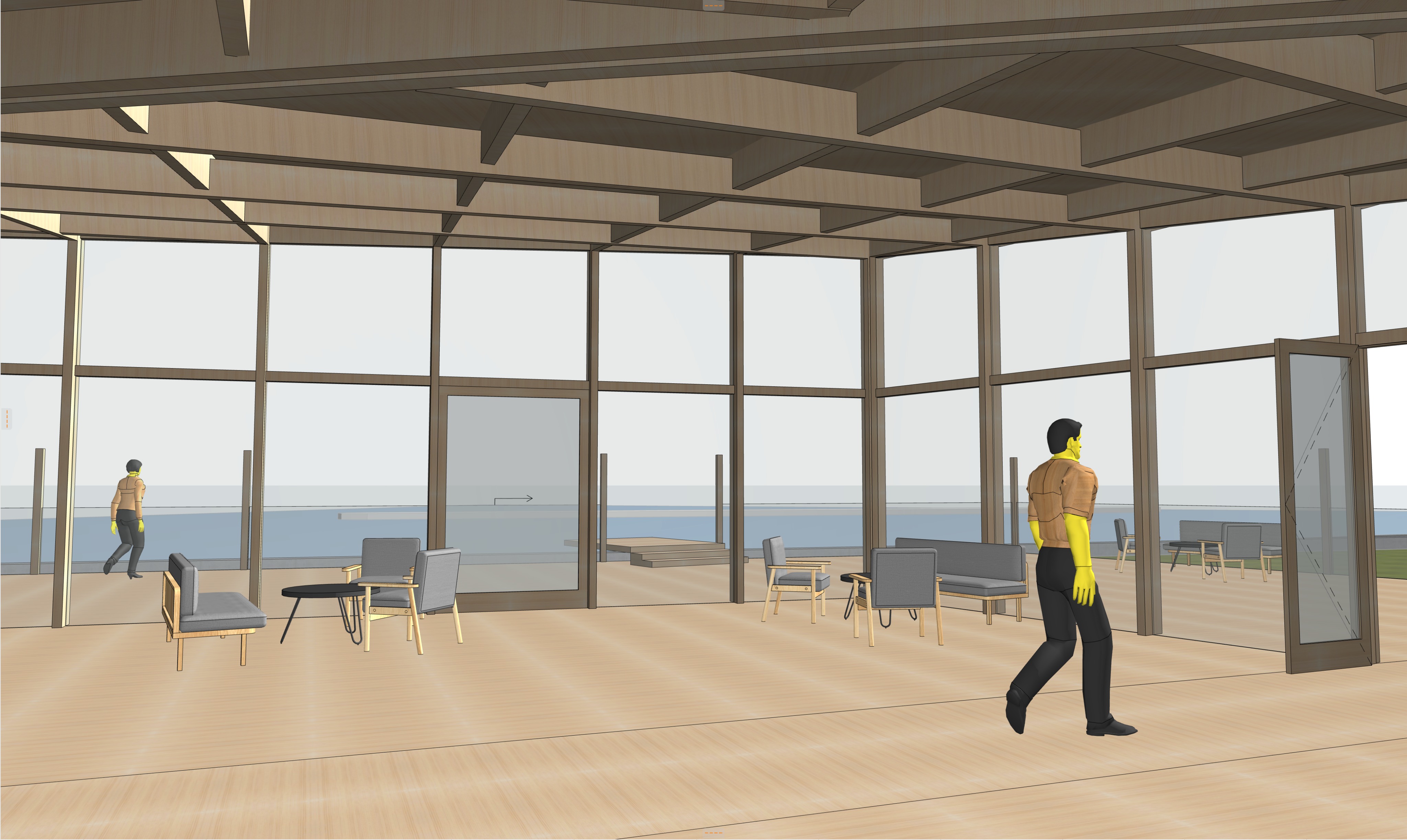gebruik het bijgevoegde beeld als referentie een warme serene architectonische interieurruimte met een open paviljoenachtig karakter een langgerekte ruimte met grote houten tafels en bijpassende houten stoelen strak en minimalistisch vormgegeven houten plafond met fijne ritmiek en enkele hangende lampen met eiken houten vloer grote vloer tot plafond glaspuien met slanke houten kozijnen zorgen voor een sterke relatie tussen binnen en buiten met zicht op het buiten terras en water zacht laagstaande zonlicht gouden uur valt diep de ruimte in en cre ert lange schaduwen warme highlights en een rustige uitnodigende sfeer materialisatie natuurlijk hout licht eiken warm getint matte afwerking ingetogen kleurenpalet interieur straalt rust ambacht en verfijnde eenvoud uit met enkele mensen fotografische stijl realistische architectuurfotografie hoge detaillering natuurlijke belichting zachte contrasten rustige compositie 35 50mm lens ooghoogte perspectief sfeerwoorden warm kalm tijdloos scandinavisch japans minimalisme hedendaagse architectuur duurzaamheid verander naast zo min mogelijk aan de afbeelding voeg enkel enkele interieur elementen toe