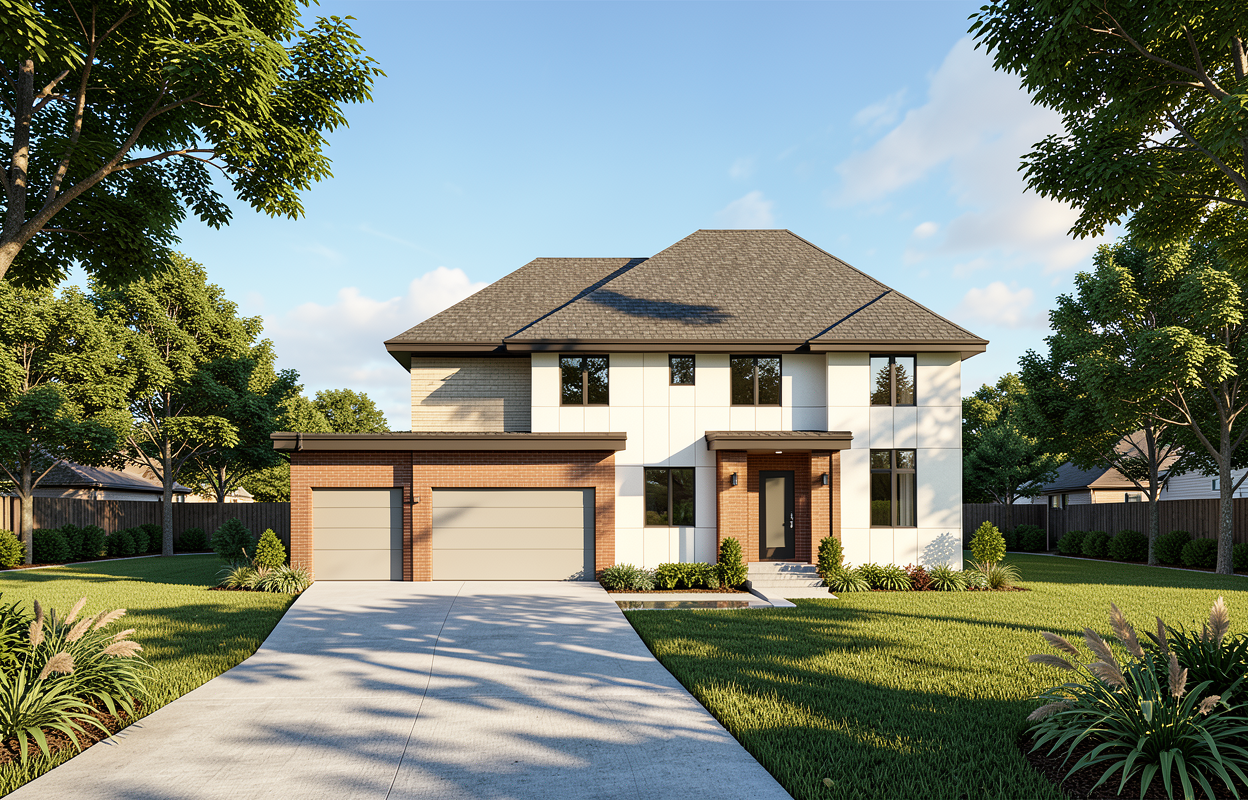 generate a high quality photorealistic render of the provided architectural elevation drawing preserve exact geometry proportions window spacing and material layout render at 4k resolution with ultra realistic daylight lighting clear sky soft shadows ambient reflections ensure all exterior materials colors and textures match the client s specifications exactly match the window grid style do not add any brick to the facade do not add extra dormers or light fixtures to the image use only the materials specified in the elevation drawing and color list match each component with charcoal roof white exterior black windows and medium cedar wood accent not brick lighting should highlight color accuracy and realistic reflectivity use global illumination and hdri sunlight calibrated for afternoon warm tone maintain true color fidelity consistent exposure and physically accurate shadows add context elements landscaping realistic lawn shrubs and shadow cast trees suited to suburban setting create asphalt driveway straight out from garage door with concrete walkway from front porch to driveway background complementary skies matching exposure no distortion or overenhancement output a single landscape oriented photorealistic rendering that is architecturally faithful visually balanced and color accurate to the above specifications